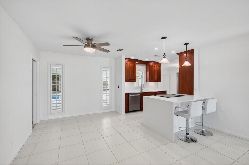 Move-in ready 4BR/2BA pool home with BONUS ROOM and FLORIDA ROOM! Filled with natural light, this charming residence sits on a spacious corner lot in the desirable Country Club Village neighborhood of East Boca Raton. Surrounded by privacy hedges and mature palms, it features impact windows, Kevlar Wind Abatement Hurricane Screens, plantation shutters, tile flooring throughout (no carpet), and a circular driveway with ample parking.Enjoy a seamless layout connecting living, dining, and kitchen spaces--ideal for both daily living and entertaining. The kitchen impresses with warm wood cabinetry, stainless steel appliances, and generous storage. A split-bedroom floor plan offers enhanced privacy, and two of the three additional bedrooms include built-in closets.