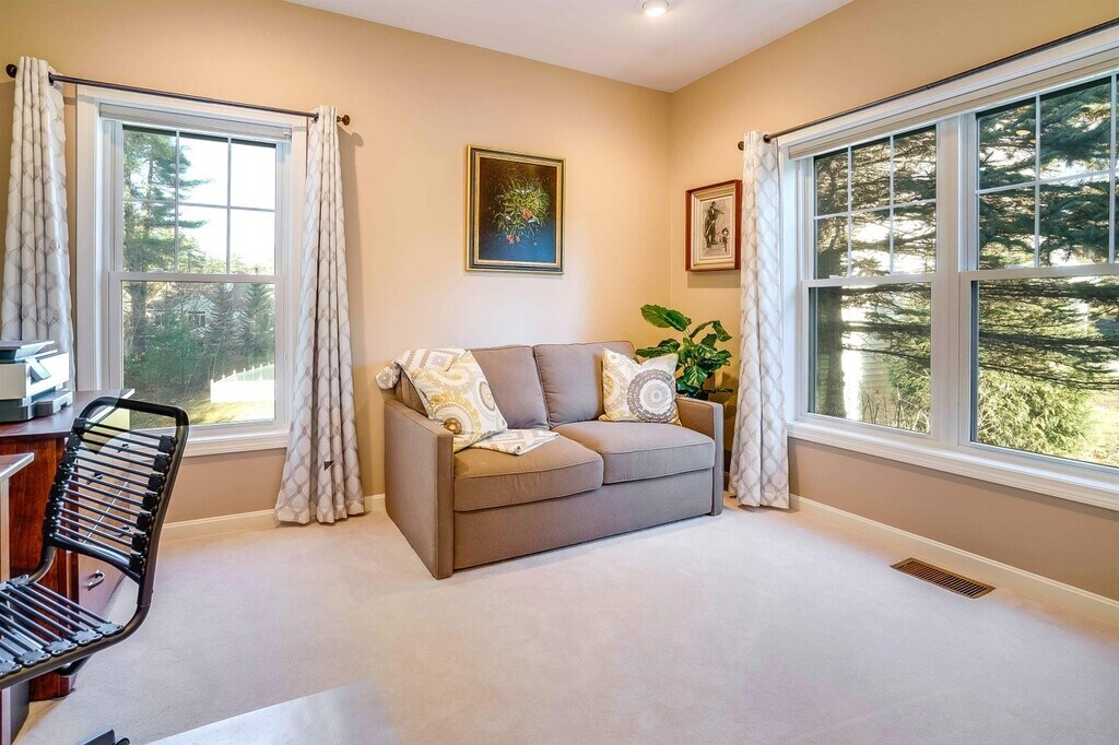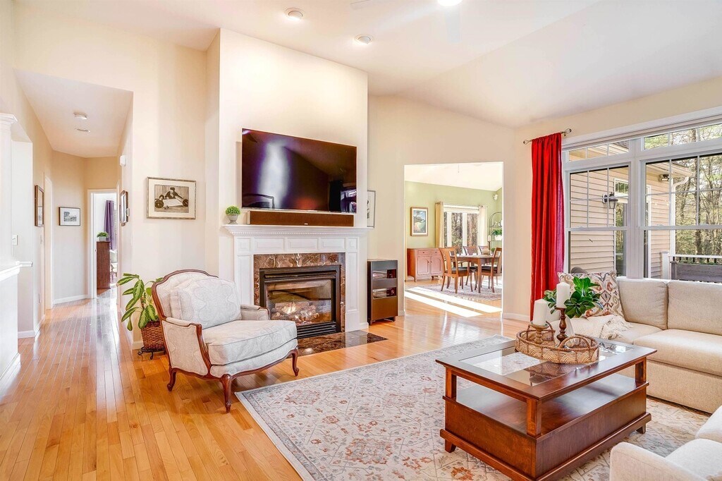 This beautifully updated ranch-style condo at The Fells at Amherst is the epitome of gracious one-floor living with even more space than usual including 9ft+ ceilings and main floor covered in spotless hardwood. Meticulously maintained, this lovely home offers an oversized family room/dining room with view of the woods and entrance to a large privately situated Trex® deck. The updated picture-worthy kitchen has a tile backsplash, upgraded appliances and an elegant back-lit built-in to showcase your collectibles plus a large pantry. Not only does this beautiful home include an open-concept living room with vaulted ceilings and gas fireplace, it also offers a palatial primary bedroom suite with 2 vanities, updated tile shower and soaking tub. A large 2nd bedroom and bathroom plus a spacious front office complete this level. Don't miss the stunning finished walkout basement including a 3rd bedroom, 3/4 bathroom and 2nd family room -- perfect for short- or long-term guests with its own Trex® covered deck and separate heating zone! For your storage and hobbies, the other half of the basement is unfinished with workshop area and another door to the wooded back yard. This beloved active social community is open to all ages and includes an inground pool, clubhouse with exercise room and is surrounded by common land and town trails -- and only a 5min drive to the town beach on Baboosic Lake. Come see why this friendly community is so popular!