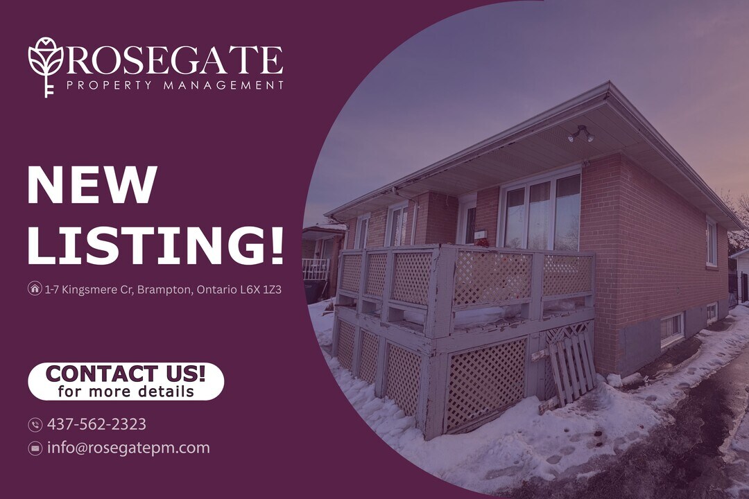 Pet-Friendly 3-Bedroom Detached Home with Parking & Front Porch in Brampton Welcome to 1–7 Kingsmere Crescent, Brampton — a well-maintained detached home offering approximately 1,200 sq. ft. of comfortable living space in a quiet, established neighbourhood. Featuring 3 bedrooms and 1 bathroom, this pet-friendly rental is ideal for families, professionals, or couples seeking a spacious and professionally managed Ontario home.The home offers a functional layout with generous living areas, providing plenty of room for everyday living and work-from-home needs. A charming front porch adds curb appeal and creates a welcoming space to relax and unwind.Enjoy access to a shared backyard, perfect for outdoor enjoyment and spending time with pets. The property also includes two parking spaces, ensuring convenience for residents and guests alike.Professionally managed by Rosegate Property Management, a trusted Ontario rental property management company, this Brampton detached house for rent is located close to parks, schools, shopping, and public transit. A rare opportunity to lease a spacious, pet-friendly home — schedule your viewing today.