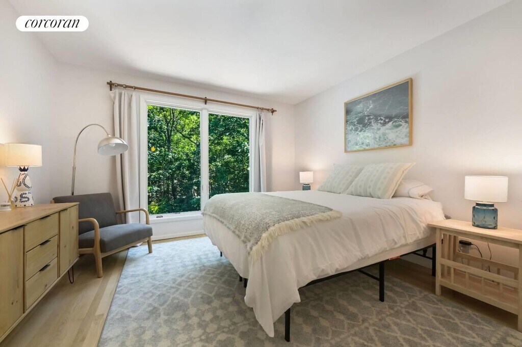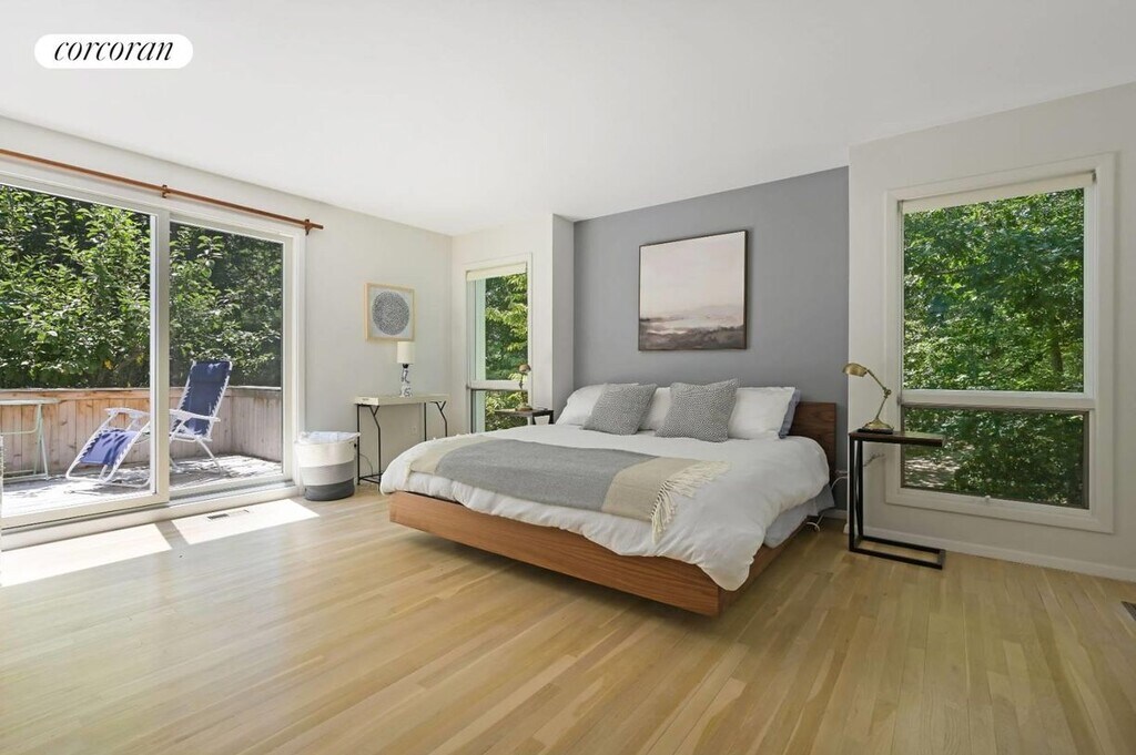 NOW BETTER PRICING.....This elegant contemporary modern saltbox home, set on a private wooded acre, is designed for light, air, and views of the lovely wooded landscape just beyond its 18 x 36-foot pool with wraparound deck. Embracing East Hampton's natural beauty it offers rights to the Landfall Community beach on pristine Gardiner's Bay and is a short drive to Sammy's Beach and Nature Preserve, one of L.I.'s magnificent quiet stretches of beach, known for spectacular sunsets and rustic hiking trails. The house has a brand new kitchen, renovated baths, all new furnishings, and three roomy bedrooms, two on the second floor, one on the first floor. The master bedroom has a full ensuite bath and a private balcony. The second upstairs bedroom overlooks the pool area and has a private ensuite half-bath and the first-floor bedroom has sliding glass doors opening out to the deck and pool and has direct access to a new full bath. Hardwood oak flooring throughout, high ceilings and a central fireplace in the great room enhance the total charm of this home. The pool and deck are perfect for grilling, entertaining, and relaxing. Central air conditioning of course. This home is calming and restorative. [[Rental Registration # 25-1055]]