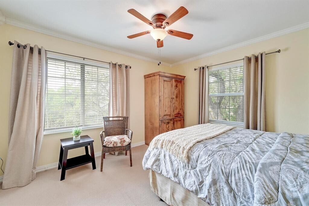 Classic Hill Country Style with Modern Comfort! Built in 1988, this Colonial Revival with farmhouse charm delivers timeless character and smart updates throughout. Offering 3 bedrooms, 2 bathrooms, and 1,536 sq ft of well-maintained living space, this inviting two-story home is ready for comfortable living in the scenic Woodcreek community. The wide front porch with a swing sets the tone before you step inside to an open floor plan with soaring ceilings and abundant natural light. The kitchen features granite counters, stainless appliances, and a peaceful view of the protected greenbelt—where deer regularly wander by. Upstairs, the primary suite provides a private retreat. The third bedroom is currently styled as a dressing room with a vanity and sink but can easily function as a nursery, guest room, or office. A screened-in back patio extends the living space, and the backyard offers a park-like feel with mature trees, trails, and natural privacy. The refrigerator and water softener are included for tenant use. With no HOA, a low tax rate, and zoning for highly regarded Wimberley ISD, this home makes everyday life easy. Woodcreek residents enjoy nearby parks, trails, and the Golf Course, while Jacob’s Well, Blue Hole, Cypress Falls Swimming Hole, and Wimberley Square are all just minutes away. Hill Country wineries, breweries, and distilleries are an easy drive, and Austin, Canyon Lake, and the airport are also within convenient reach. This property offers charm, comfort, and a quiet Hill Country setting—ready for its next tenant to enjoy.