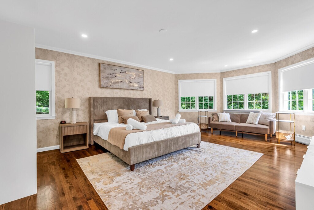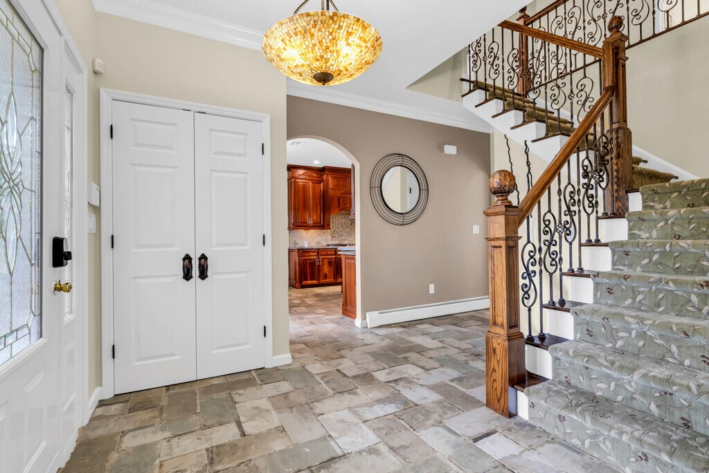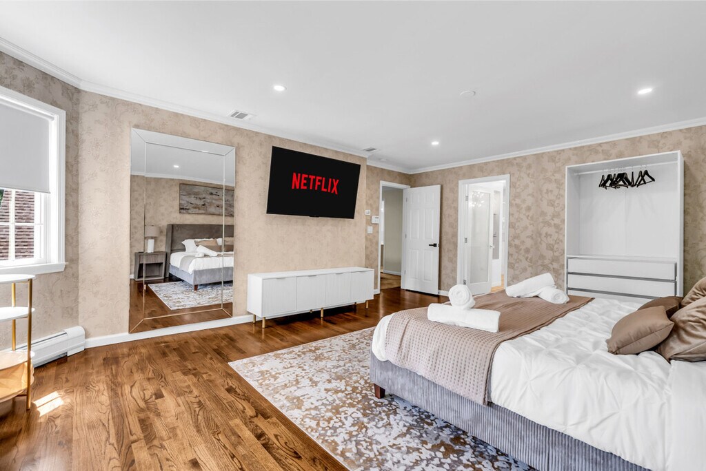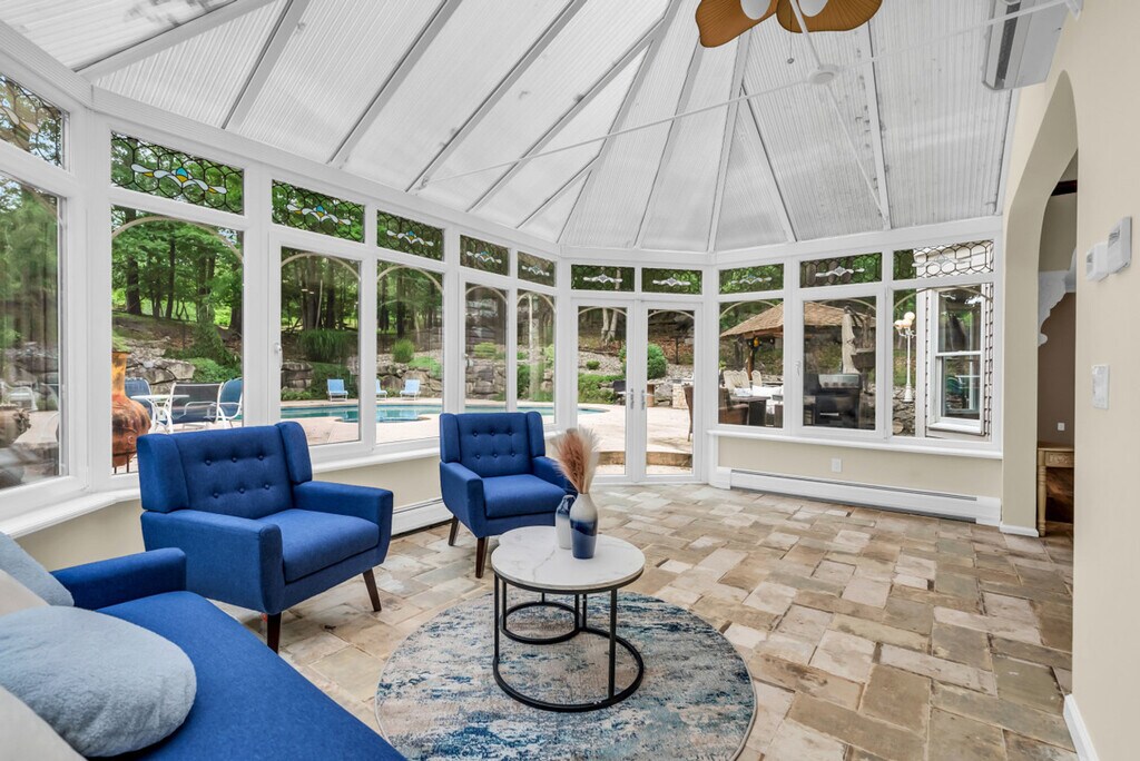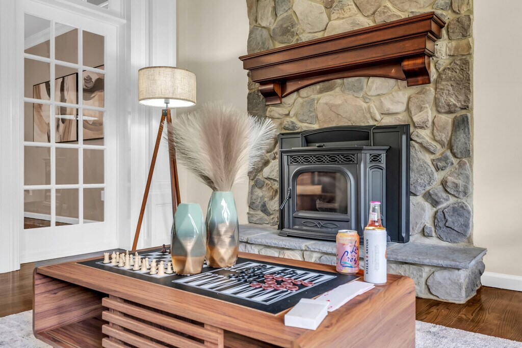 Feel at home in this serene home located in the hills of Stony Point, NY. This home features a large front porch with comfortable seating for 5, where you can relax in the shade while enjoying the beautiful views. The wide entryway leading into this home has a large coat closet. Ahead of you is the beautiful winding staircase with wrought iron railing which leads upstairs. The large cherry wood kitchen boasts brand-new appliances, including a dishwasher, refrigerator, 2 ovens, coffee machine, stovetop, microwave, and blender. The kitchen has pots and pans, cutlery, and dishware for your convenience. There is plenty of room for family dinners in the expansive dining room which overlooks the backyard. A bar area is situated right between the kitchen and dining room. Make use of the wine cooler and pop a cork in the breathtaking sunroom which overlooks the backyard’s beautiful landscaping and sparkling pool. With modern, comfortable seating, the sunroom is the perfect spot for you to connect with friends while admiring the view through the windows surrounding you. This home features large flatscreen TVs, free high-speed Wi-Fi, a dining table that seats 12, a patio, outdoor bar, BBQ grill, and a fully equipped laundry room. The garage, converted into a gym and game room, includes a treadmill, bike, dumbbells, pool and foosball tables, and a refrigerator. There is a $50 charge per day to have the pool heated. This home is set off the road with a long driveway ensuring your complete privacy. The manicured landscaping throughout the property is sure to impress, and the large backyard is fully fenced and private. The sparkling heated in-ground pool is set right off the patio. The large pool area has everything a heart can desire. A heated jacuzzi is connected to the pool. Daybeds and wicker rocking chairs surround the pool. A beautiful fireplace and seating area allow you to sit around after taking a dip. In case you’d like to have an outdoor meal, the grill and patio set are nearby. A bar area completes this space. This home is located in a residential area; therefore, no loud noise is allowed after 9 pm. Please be considerate of the neighbors and do not park on the road. No smoking is allowed and there will be a $500 penalty if violated. There is a $175 penalty fee for lost keys. There will be a $300 penalty fee for early check-in or late check-out that is unauthorized. [SI]