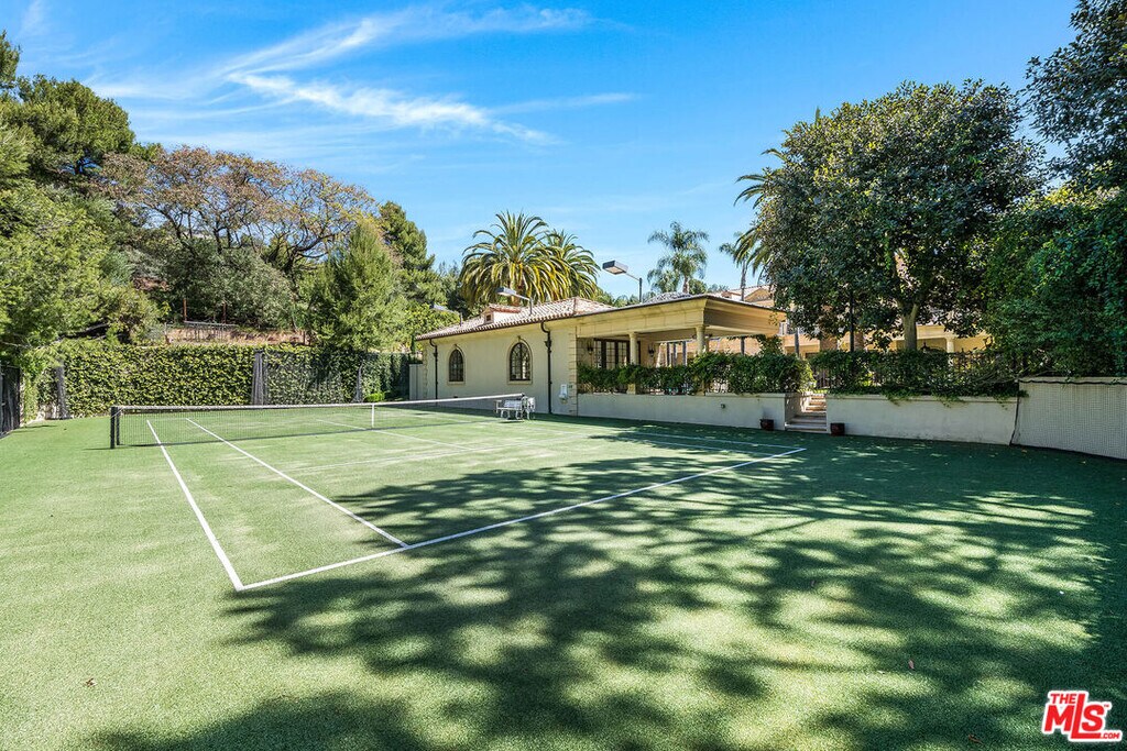Set within the guard-gated enclave of North Beverly Park, this stately villa sits on approximately 3.6 private acres in one of Los Angeles' most sought-after communities. A soaring double-height entry sets the tone, opening to principal rooms designed for both grand entertaining and daily ease. A light-filled living room with terrace access, a wood-paneled study, formal dining room, and a bar-appointed family room. Arched windows draw in natural light throughout, while a series of beautifully crafted fireplaces anchor the main gathering spaces. The upper level includes a primary suite of considerable scale, offering dual bathrooms, dual walk-in closets, a fireplace, and a private terrace overlooking the manicured estate below. Four additional en-suite bedrooms, a secondary office, and a dedicated entertainment wing with bar, media and game room.Outside, mature palms and layered landscaping frame a resort-caliber setting: a swimmer's pool, dual spas, a pool house with full kitchen, an outdoor dining pavilion, a firepit, and a North/South tennis court. Privacy, scale, and the ease of indoor-outdoor living; this is Beverly Hills at its finest. MLS# 26760161