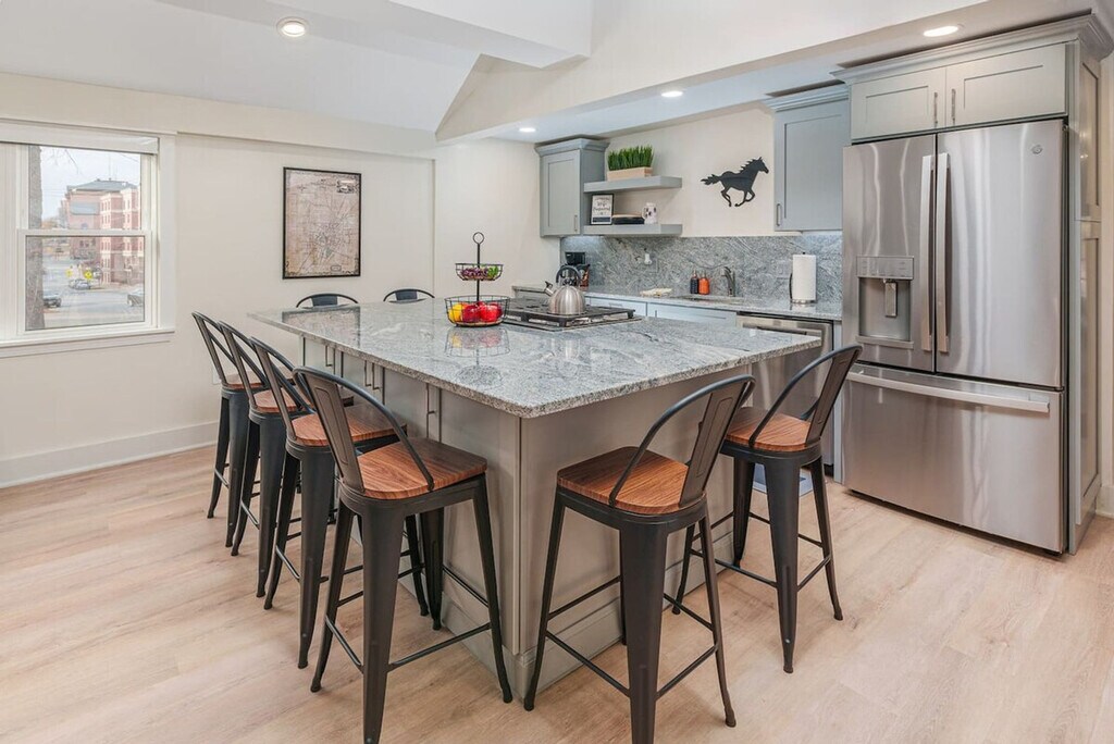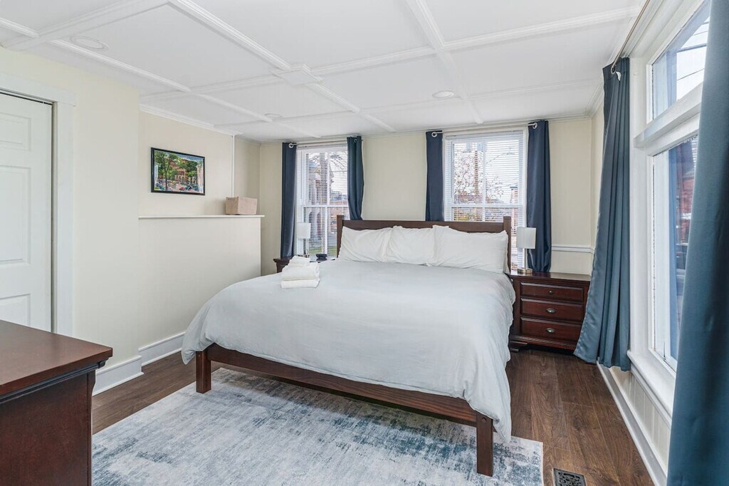 Welcome to this 6-bedroom gem in the heart of downtown Saratoga Springs! Perfect for groups, this spacious home comfortably sleeps 14 and is within walking distance to Broadway’s shops, restaurants, and entertainment. Enjoy a fully equipped kitchen, cozy living spaces, and Smart TVs. Just minutes from the Saratoga Race Course, Saratoga Spa Golf, and Saratoga Lake, it’s the ideal spot for exploring the best of the area. Your unforgettable getaway starts here! This freshly renovated home is designed for a stress-free and comfortable stay. The living room features a brand-new, spacious couch with plenty of seating for everyone and a 60-inch Smart TV, perfect for relaxing or enjoying your favorite shows. The kitchen has brand new stainless appliances throughout and is fully stocked with pots, pans, utensils, and a stovetop kettle for tea. A crockpot for winter comfort foods and a blender for refreshing summer cocktails are also available. Each bedroom has a brand new plush mattress, dresser, and closet space, with lamps featuring built-in USB chargers next to each bed. A washer and dryer are also on the first floor for your extended stays. An iron and ironing board are provided for your convenience. Parking is available for 6 vehicles on the premises, with additional street parking available. Located just 0.2 miles from Broadway, this home is perfectly situated for exploring Saratoga Springs. It is 0.4 miles to Congress Park Carousel, 1.1 miles to Saratoga Race Course, 1.5 miles to the Children's Museum at Saratoga, 4.3 miles to Saratoga Lake Boat Launch, 9.4 miles to Brown's Beach, 22 miles to Six Flags Amusement Park, 29 miles to Lake George, and 53 miles to Gore Mountain Ski Area. The minimum booking age is 25. Guests are required to sign the property rental agreement, which includes the house rules. This is a pet-free home. The home is fitted with a smart door lock and free parking for vehicles is available on the premises. We're available if you need us, but we don't intend to bother you so you can concentrate on relaxing. If you have some work to do, enjoy blazing fast internet and dedicated work spaces in 4 of the bedrooms. A laptop computer is not included. [SI]