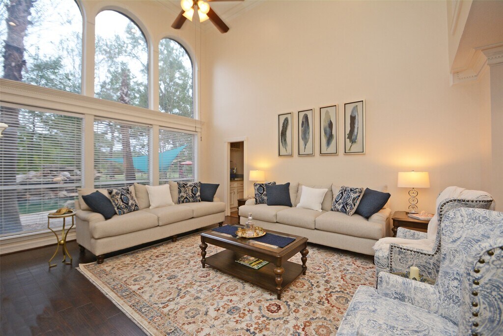 Outstanding custom home that backs to the Oaks Golf Course in Panther Creek! Centrally located in the heart of The Woodlands on a cul-de-sac street,zoned to exemplary schools and close to parks,shopping and restaurants! Soaring ceilings,stunning hardwood floors,sweeping staircase,Plantation shutters,crown molding,abundant windows & built-ins throughout. Island kitchen with SS appliances,breakfast bar and granite counters opens to breakfast room and den with gas log fireplace; both formals; handsome wood paneled study; primary retreat downstairs; 3 bedrooms and game room up with balcony upstairs. Backyard features sparkling pool w/ rock waterfall,spa,covered patio and charming wooden bridge overlooking the beautiful fairways! 3 Car Garage & plenty of storage space. Refrigerator,washer & dryer are included. Trash service is included. Pool and/or Lawn Service may be included for an added fee. Advertized price is for a 2 yr lease. Home is also available as a Short Term Rental. MLS# 51903379