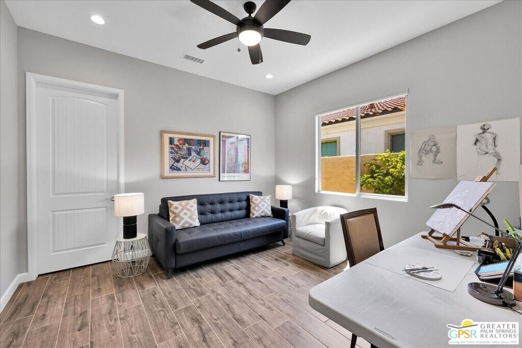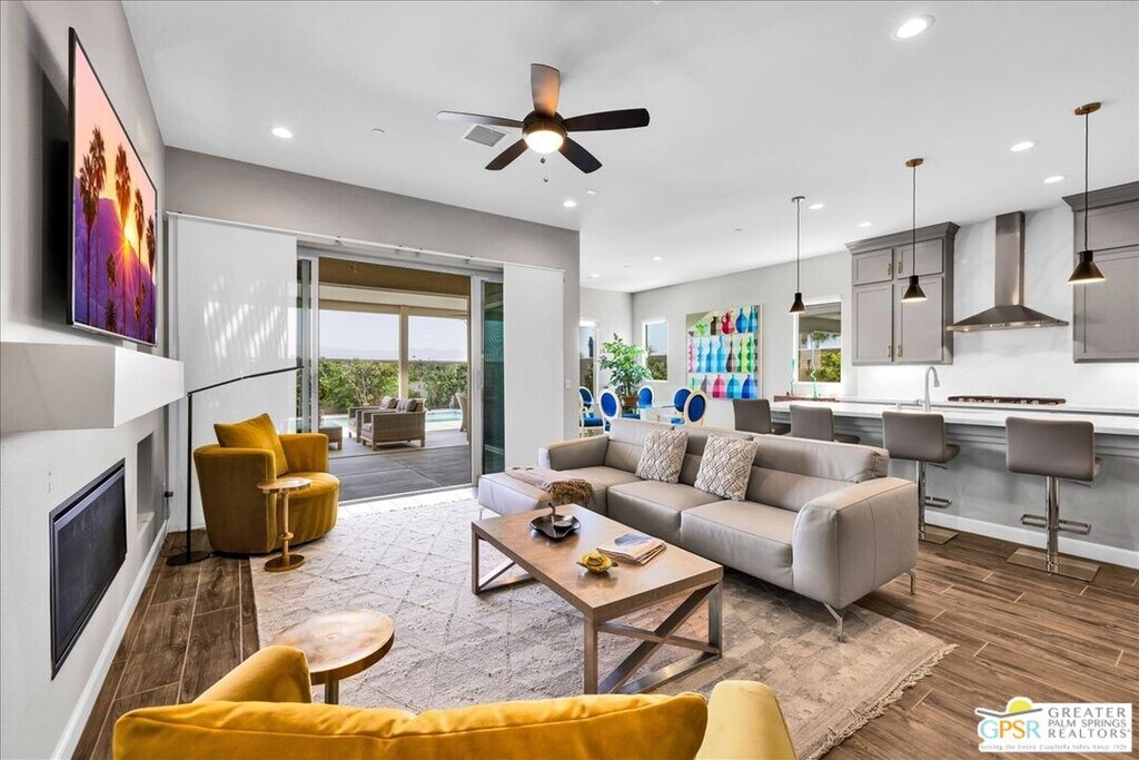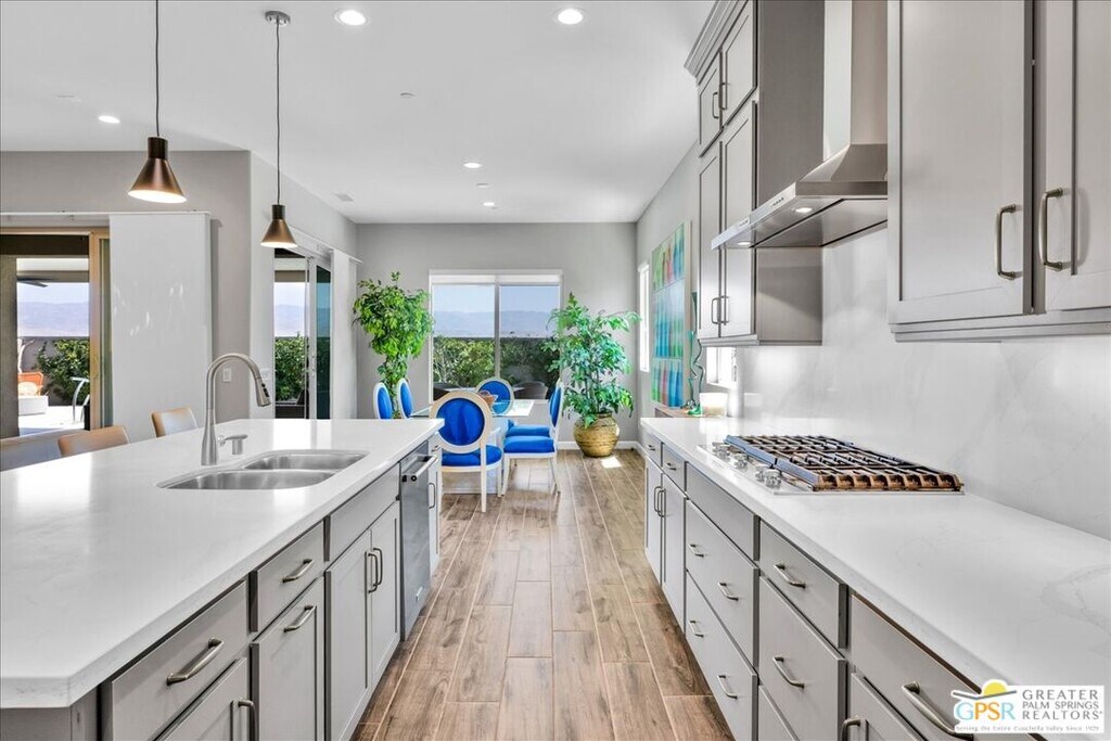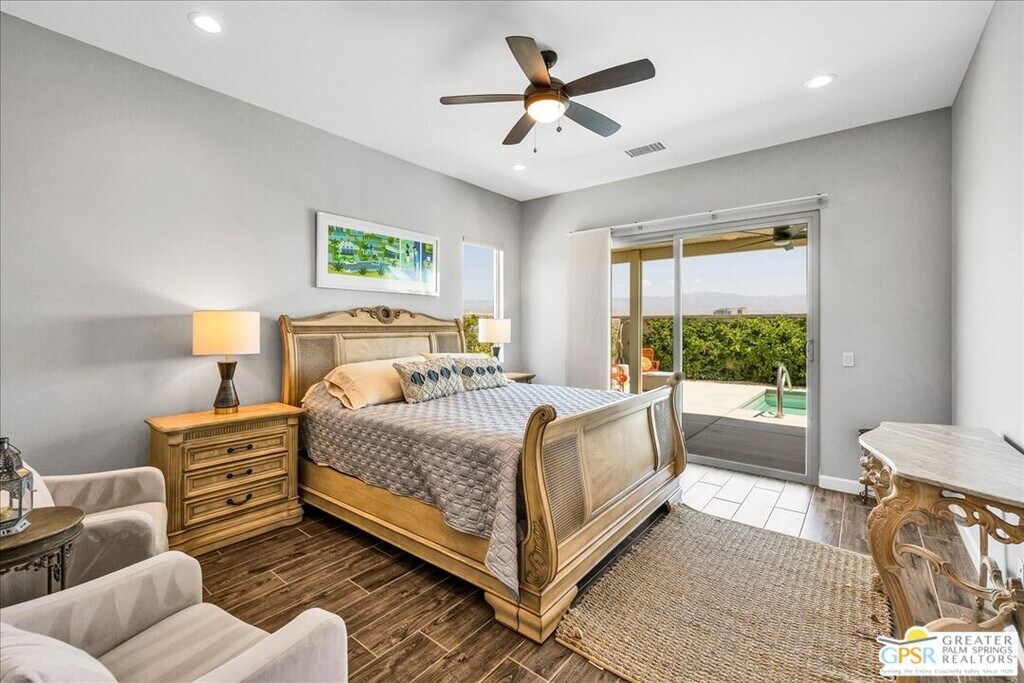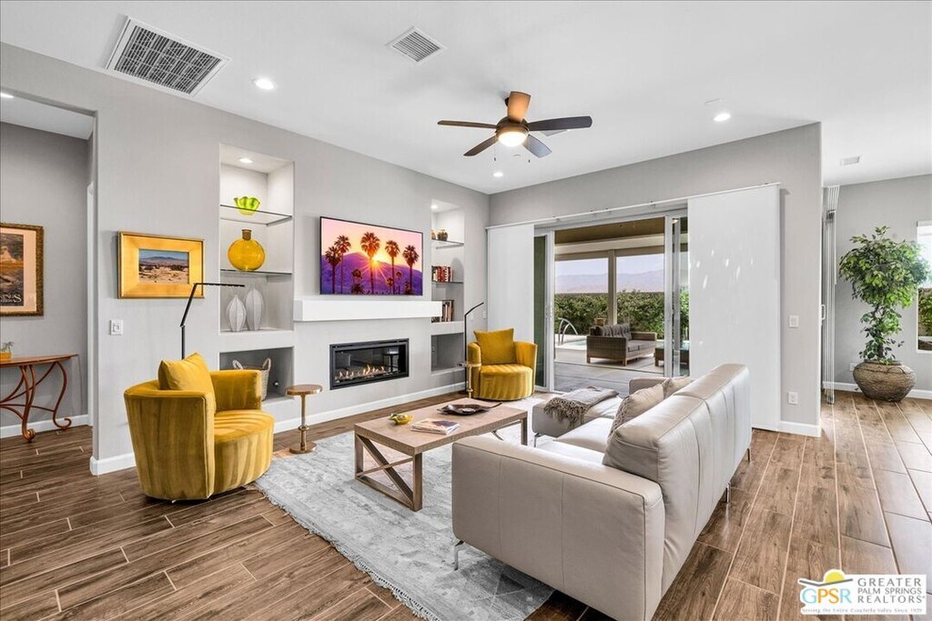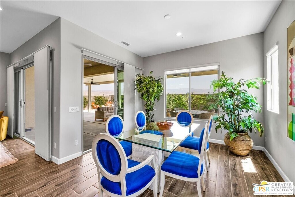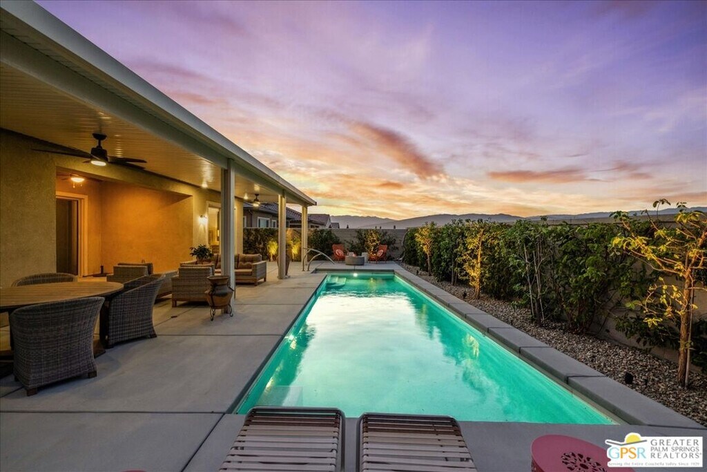 Lease in Del Webb 6-12 Months! Highly upgraded and amazing Panoramic Mountain views! Upgraded porcelain tile, ceiling fans, and custom window treatments throughout. This Phase 6, PLAN 7, REFUGE, with Tuscan facade has three bedrooms and two and a half baths. Kitchen features upgraded 42-in upper cabinets with Jewel cabinets and crown molding in a gray finish with upgraded matte gold hardware, kitchen features upgraded quartz countertops with full backsplash to ceiling, upgraded KitchenAid professional series appliances with Bluestar refrigerator, and large island with ample space for seating. The kitchen overlooks the great room featuring upgraded center glass sliding doors, a fireplace and built-in display niches with LED lighting as well as a built-in wet bar with ample cabinetry and beverage refrigerator. The primary bedroom offers breathtaking panoramic Mountain views and an upgraded glass sliding door offering access to your private pool. The ensuite bathroom features an upgraded no threshold glass enslosed rain shower with bench, upgraded gray cabinetry with dual sinks and a large walk-in closet. The guest wing is located on the opposite end of the home and offers access to the two additional bedrooms and a full bath. This home also features a versatile flex space that can be used as a den, media room, yoga space or more. This home also features an upgraded laundry room with additional cabinet storage and utility sink and SOLAR! Step outside into the backyard until your covered patio space and take in the magnificent Mountain views from your extended covered patio. Complete with LED lighting and ceiling fans as well as a custom angular modern pool. This home is an entertainer's delight with ample yard and extended covered patio spaces as well as mingling areas and ample space for guests. Come see all that this 55+ community of Del Webb has to offer in prestigious Rancho Mirage with access to a state-of-the-art clubhouse featuring a bar, billiards table, pool and Spa, fitness center, and so much more. *Home Leased Unfurnished MLS# 25620709PS
