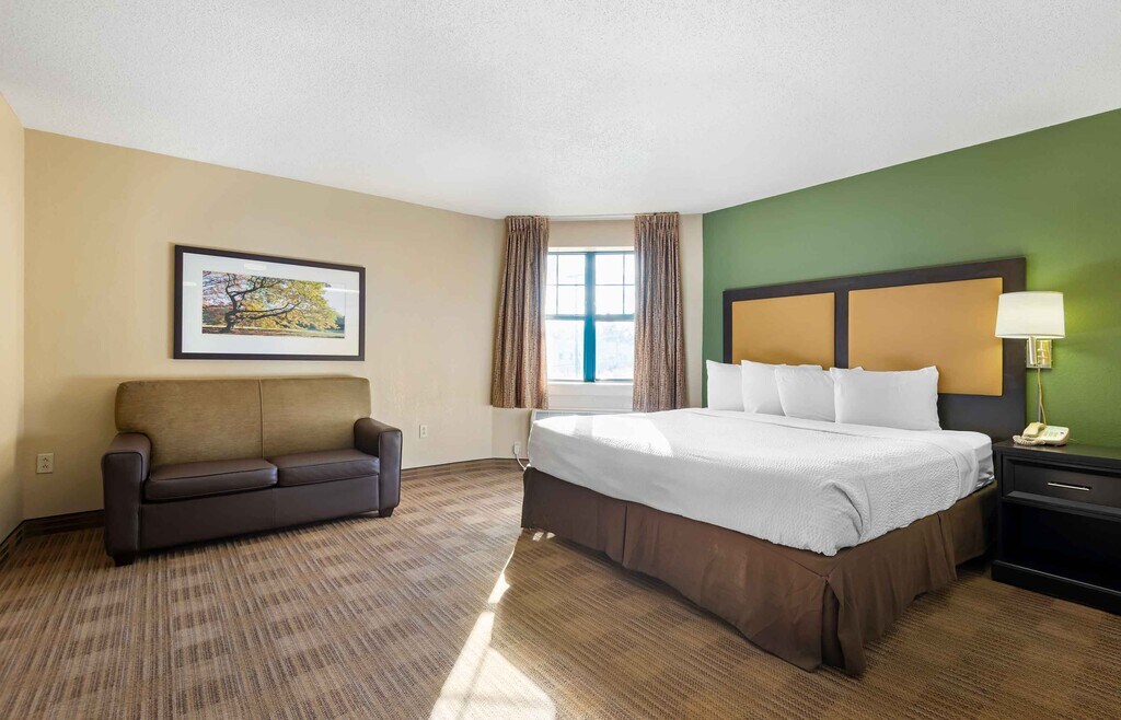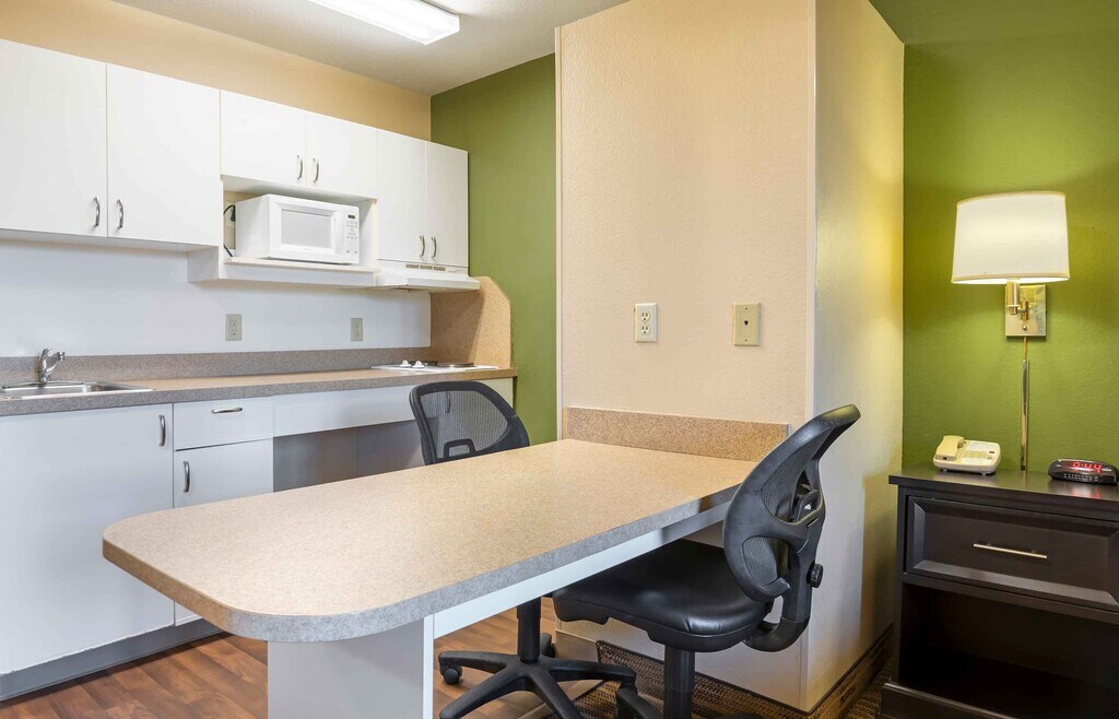 Enjoy a fully furnished studio suite in our hotel at an affordable rate with free wi-fi, free utilities and free premium cable. Each studio suite has a full kitchen with full-size refrigerator, stovetop and microwave, and has a flexible workspace and plenty of storage. All our hotels are pet-friendly and have on-site guest laundry available. Plus, there are no long-term commitments and you can adjust your length of stay to meet your individual needs, subject to applicable property and/or local restrictions. Additional fees may apply. Booking restrictions and taxes apply. Rates and availability are subject to change without notice.