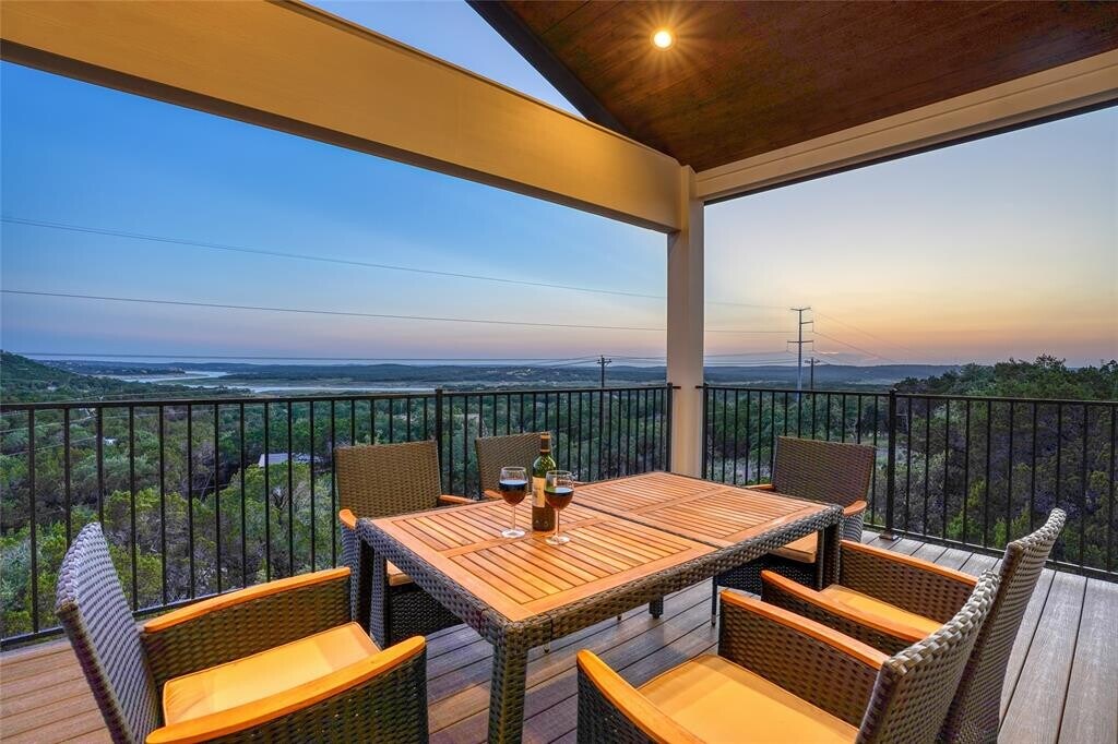 This is a custom designed home built to maximize views and natural light. The house has three balconies and rock patio with stunning hill country and lake views! The main level has the large living room with fireplace, high beamed ceilings, and open concept with the kitchen and dining area. It also draws your eye with large windows showing hill country & lake views. The kitchen features a large kitchen island with bar stool seating, abundant cabinets, high-end quartzite (natural stone) counters, and built-in stainless-steel appliances. The main level balcony extends the entire backside of the home with gorgeous views, recessed lighting, & two fans. An office is provided with Spectrum fiber internet. Next door is the spacious primary bedroom with spectacular views. There is also a half bath for guests. The lower level has a private flex-space with wet bar, huge private balcony, two amply-sized bedrooms, third full bathroom, garage, & laundry room with storage space. The upper level has a large fourth bedroom or flex space with private bathroom and balcony. There is NO CARPET and luxury finishes throughout. Fridge, washer, and dryer are included. The home will be unfurnished. There is parking for about 6+ cars, including space for boat parking. Xeriscape yard. Schools include Lago Vista Elementary (A- rated, 4 min. away), Middle School (A-, 5 min.), and High School (B) rated by We allow up to two pets with no breed restrictions. Community private amenities include 9 lakefront parks, campground (2 min. away), 6 party pavilions, 5 playgrounds, 2 fitness centers, 4 boat ramps, marina, 24/7 indoor fishing well, swimming pool, tennis courts, basketball court, a 9-hole disc golf course, tennis/pickleball courts, sand volleyball court, athletic field, hiking paths, & multiple buildings w/5 meeting rooms available to rent. Lowe’s Market, CVS, Farmer’s Market, and food spots are 4 min. away. Open House 5/23 from 12:00-2:00 pm. See the home website for more info. MLS ID 5847743
