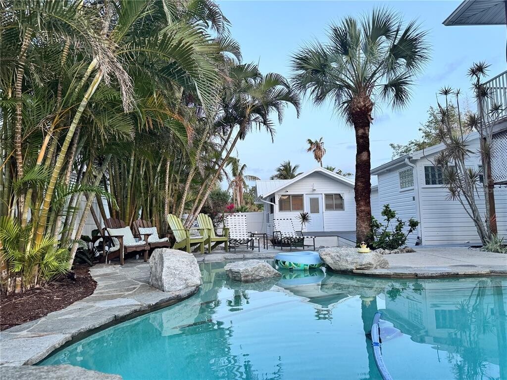 Completely reimagined 1920s historic bungalow,originally the Longboat Key Post Office,located just two blocks from Whitney Beach and one block from Sarasota Bay and public boat ramp access. This charming single-story residence is a meticulous rebuild with an open-concept great room featuring high ceilings,abundant natural light,and a gourmet kitchen equipped with stainless steel appliances and a gas range. The private,fully fenced backyard offers a heated swimming pool,separate hot tub,lush tropical landscaping,and the soothing sound of swaying palms. Serene Village location with no public parking ensures exceptional peace and privacy. Ample boat/RV parking on site and deeded bay access steps away. Walk to Mar Vista Dockside Restaurant & Pub; minutes by car or bicycle to St. Armands Circle and Lido Beach. Offered fully furnished for a minimum 28-day rental period. Two king suites with dual closets each plus queen sleeper sofa in Main House. There is an optional one-bedroom apartment above the garage with a queen bed. Ideal snowbird retreat or extended-stay executive residence. Available now. MLS# A4673262