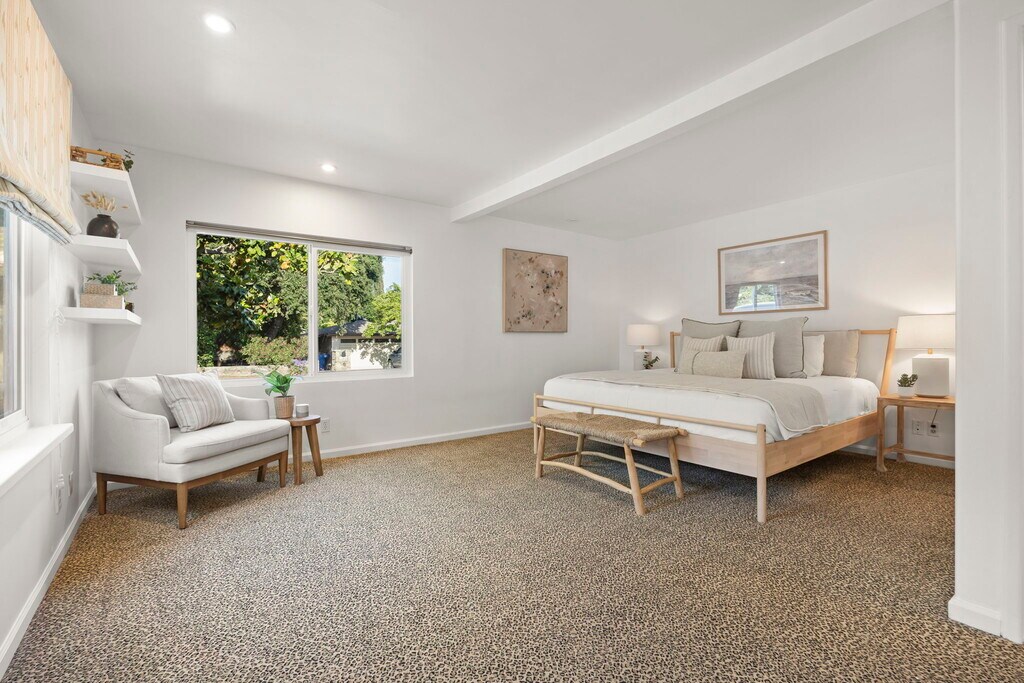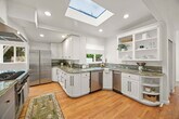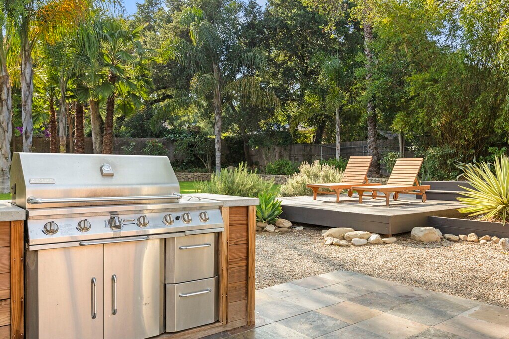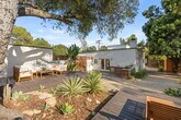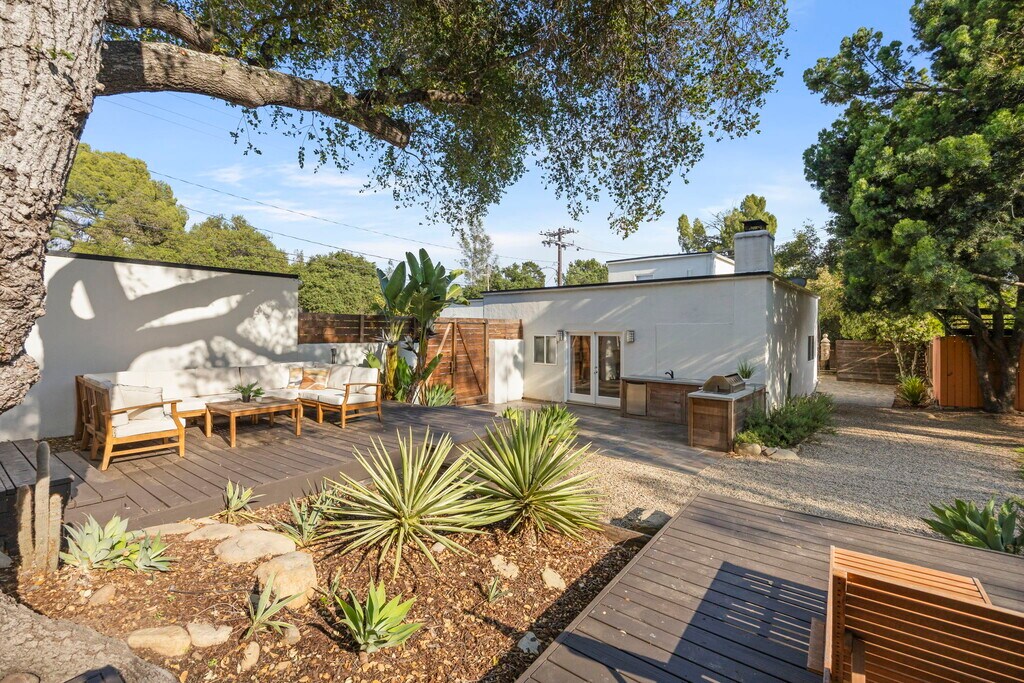 With an enviable location at the upper end of Canada St just blocks from downtown Ojai, this one of a kind 4 bedroom 4 bath Art Deco home features curved lines with a Mid Century feel. Upon entering you are greeted with ample windows allowing natural light to filter in. A gourmet kitchen opens up to the generous living room and dining room area equipped with a cozy fireplace and french doors leading out to the spacious backyard. Upstairs you will find a separate guest wing with its own private rooftop patio to enjoy the mountain views. Situated on . 38 acres with decks for lounging, fruit trees, a fountain and mature landscaping. Additional features include a detached 2 car garage and an outdoor BBQ area. A true retreat in the heart of Ojai!
