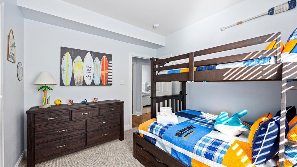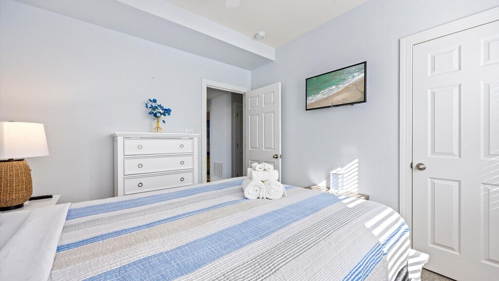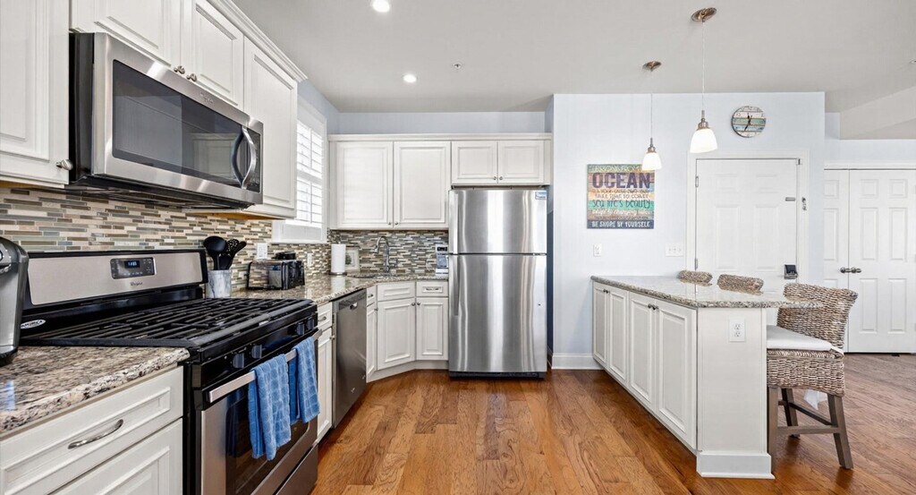 Feel at home in the luxurious Oceanside Retreat, a stunning 5-bedroom condominium in the heart of downtown Ocean City, NJ. This spacious and stylish getaway offers everything you need for an unforgettable vacation. The open-concept living area features plush seating, a large TV, and plenty of natural light. The fully equipped modern kitchen includes stainless steel appliances, all cookware and dishes, a toaster, blender, Keurig coffee maker, an island with bar seating, and ample counter space. There is also a spacious dining area for enjoying meals together. This apartment also features a private front porch to relax and enjoy the ocean breeze, as well as 2 Juliet-style balconies in the primary bedroom and one of the guest rooms. Linens, towels, and essential amenities are included, and there is a washer and dryer in-unit for easy laundry during your stay. Beach gear is provided, including 10 beach tags on a lanyard, 10 beach chairs, 2 coolers, a wagon/cart, and an umbrella. Off-street parking is available for up to 2 vehicles, 1 in the garage and one in the parking area, plus ample free and metered street parking in the neighborhood. Nestled in the heart of downtown Ocean City, this luxurious Oceanside Retreat offers unparalleled access to the best of the Jersey Shore. The pristine sands of the beach are just a short stroll away, and the vibrant boardwalk, a hub of activity filled with classic amusement park rides, arcades, and delicious treats, is also nearby. A variety of restaurants are within walking distance, from casual eateries to upscale dining experiences, and unique boutiques and souvenir shops are close by. Quiet hours are between 10 pm and 8 am. Guests must be respectful of neighbors and the community at all times. Any disturbance incident that results in police involvement may result in the immediate termination of the reservation and removal from the rental without refund or warning. There is a zero-tolerance policy. All properties are absolutely no smoking of any kind, including cigarettes, cannabis, vapes/e-cigs, etc. Smoking is permitted outside and well away from any doors or windows, and all debris must be cleaned up. Any evidence of smoking will be automatically billed an additional cleaning fee. Guests are fully responsible for any damage, excessive cleaning, or disturbances caused by their pets during their stay. By bringing a pet onto the property, you agree to assume all liability for your pet's behavior and to indemnify and hold harmless the property owner and management from any claims or damages arising from your pet. Guests with pets are 100% responsible for keeping their pet under control at all times. Size/weight and breed restrictions may apply. For listings marked “no pets” - this is strictly enforced. If you have a service animal, it is kindly requested that you book one of the pet-friendly listings. There are security cameras present on this listing in the following locations: exterior front entryway/doorbell camera, exterior rear entrance and deck/patio/driveway area. These cameras may record audio and video footage 24/7. There are absolutely no recording devices of any kind inside the home or apartment or any other private area. [SI]