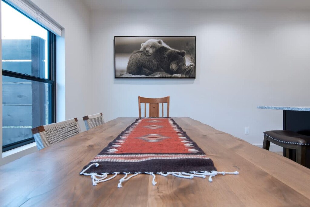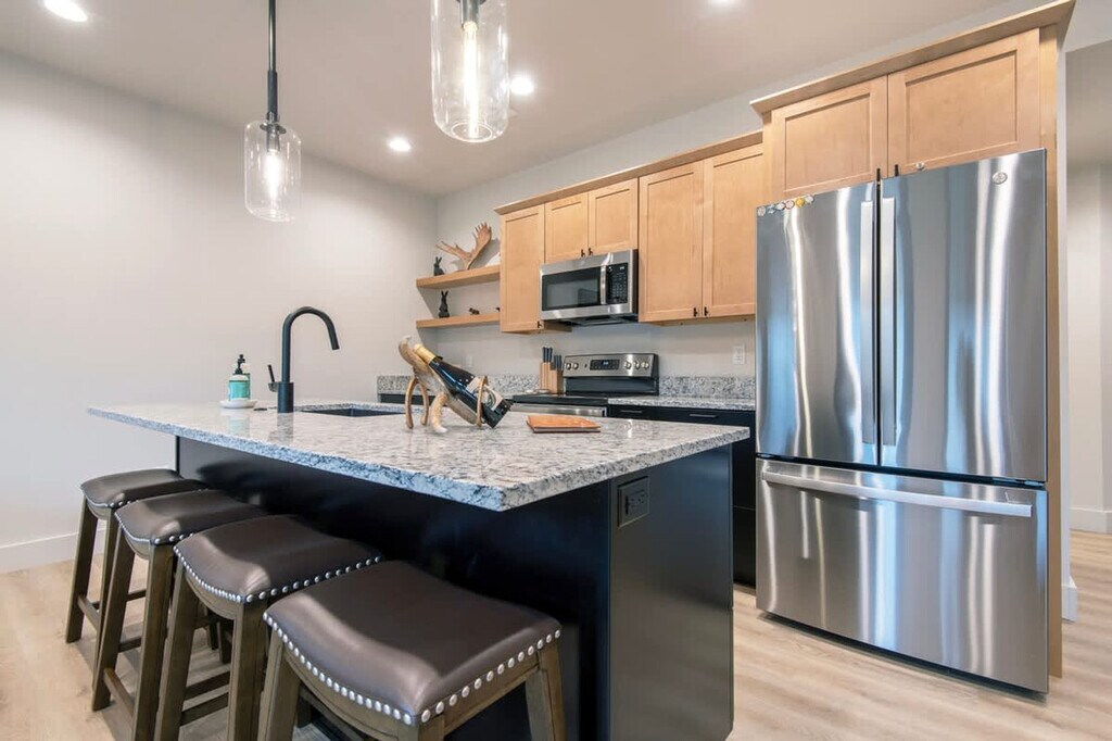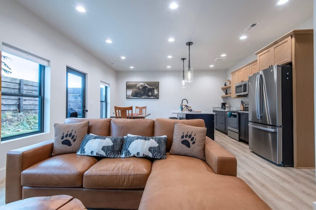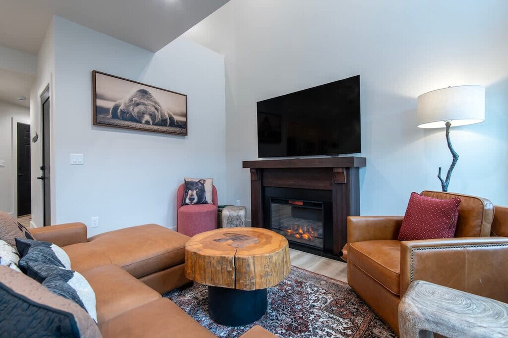 Nestled at the base of the Teton Mountain Range, this inviting townhome offers a warm retreat with charming bear-inspired details. Whether you're here to explore the stunning national parks or simply to relax and recharge, this delightful home is your perfect haven. The townhome features a modern design with rustic touches inspired by the wildlife and natural beauty of the Tetons, ensuring you feel at home from the moment you step inside. Step into this brand-new townhome and feel instantly at home in its inviting, cozy atmosphere. The main level boasts an open-concept kitchen and living space, perfect for gathering, with quartz countertops, a spacious island, and all the tools needed to cook up a feast after a day of adventure. Relax on the plush sofa as the electric fireplace warms the room, and enjoy board games or a movie night on the large Smart TV. Upstairs, all three bedrooms offer added privacy. The primary bedroom features a luxurious king-size bed, a private en-suite bathroom, and a dedicated workspace with a desk and computer monitor, perfect for remote work or catching up on emails. The queen bedroom offers a cozy retreat, while the third bedroom includes two twin beds, ideal for kids or friends traveling together. Additionally, there is a Level 2 EV charger in the garage for guest use. The townhome includes a large 2-car garage with plenty of room for vehicles, gear, and outdoor equipment. Enjoy the comfort of air conditioning year-round. A welcome gift of a complimentary bottle of wine is provided upon check-in. The central location of this townhome makes it the perfect base camp for outdoor enthusiasts and families alike. Enjoy summer activities such as hiking on serene trails, paddleboarding and kayaking on the Teton River, fly fishing in legendary rivers, and biking on nationally renowned trails. In winter, experience the best powder skiing and snowboarding at Grand Targhee Resort and Jackson Hole Mountain Resort, or enjoy snowshoeing and cross-country skiing in Teton Valley. The townhome is minutes from Driggs for dining, groceries, and local shops, and close to Grand Targhee for both summer and winter activities. Grand Teton National Park is a 53-minute drive, and Yellowstone National Park's South Entrance is just over two hours away. Guests are expected to treat the home as if it were their own and be respectful of the rules, neighbors, and local community. Quiet hours are from 9 pm to 8 am. No events, parties, or large gatherings are allowed. Smoking or vaping in the home or on the decks is prohibited, and an additional charge will be applied if any butts are found on the property. Exterior lights should be turned off at night to preserve the dark skies. A maximum of two licensed vehicles is allowed in the driveway and garages. Snow machines, dirt bikes, or ATVs are not permitted in the subdivision or at the rental property. Candles or incense should not be burned in the home, and fireworks are not allowed on the premises. All main entry doors should be locked when not occupied. Fines will apply for violations, including but not limited to smoking in the house or garage, failure to follow house rules, and failure to vacate at check-out time, with a minimum $500 fine for smoking/vaping/marijuana in the house or garage, violation of house rules, posted signs, laws, or failure to vacate at check-out time. The primary bedroom includes a dedicated workspace with a desk and computer monitor, perfect for remote work or catching up on emails after a day of adventure. A laptop computer is not included. [SI]