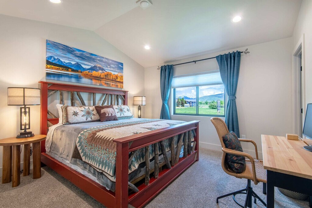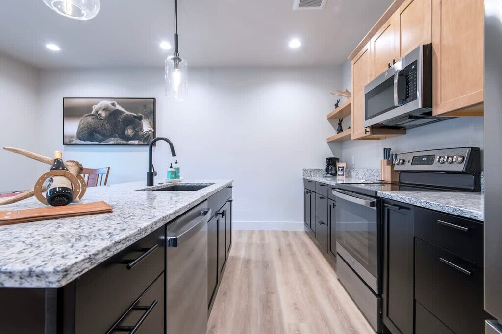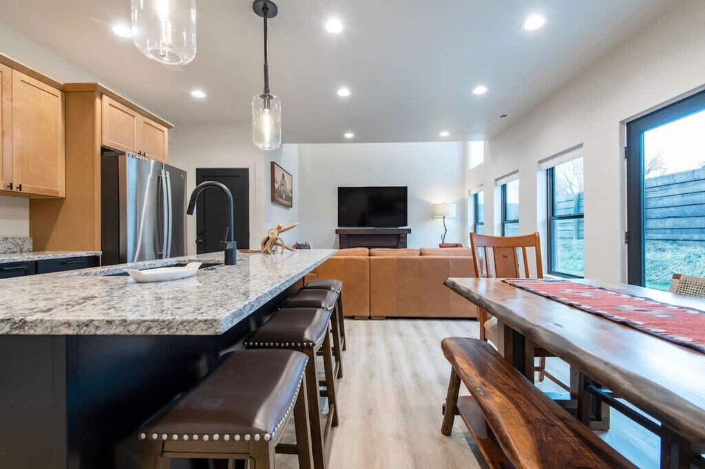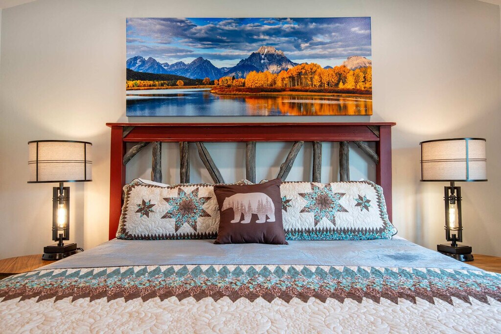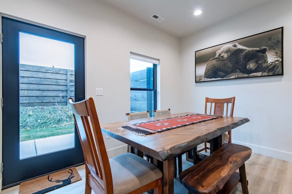 Nestled at the base of the Teton Mountain Range, this inviting townhome offers a warm retreat with charming bear-inspired details. Whether you're here to explore the stunning national parks or simply to relax and recharge, this delightful home is your perfect haven. The townhome features a modern design with rustic touches inspired by the wildlife and natural beauty of the Tetons, ensuring you feel at home from the moment you step inside. Step into this brand-new townhome and feel instantly at home in its inviting, cozy atmosphere. The main level boasts an open-concept kitchen and living space, perfect for gathering, with quartz countertops, a spacious island, and all the tools needed to cook up a feast after a day of adventure. Relax on the plush sofa as the electric fireplace warms the room, and enjoy board games or a movie night on the large Smart TV. Upstairs, all three bedrooms offer added privacy. The primary bedroom features a luxurious king-size bed, a private en-suite bathroom, and a dedicated workspace with a desk and computer monitor, perfect for remote work or catching up on emails. The queen bedroom offers a cozy retreat, while the third bedroom includes two twin beds, ideal for kids or friends traveling together. Additionally, there is a Level 2 EV charger in the garage for guest use. The townhome includes a large 2-car garage with plenty of room for vehicles, gear, and outdoor equipment. Enjoy the comfort of air conditioning year-round. A welcome gift of a complimentary bottle of wine is provided upon check-in. The central location of this townhome makes it the perfect base camp for outdoor enthusiasts and families alike. Enjoy summer activities such as hiking on serene trails, paddleboarding and kayaking on the Teton River, fly fishing in legendary rivers, and biking on nationally renowned trails. In winter, experience the best powder skiing and snowboarding at Grand Targhee Resort and Jackson Hole Mountain Resort, or enjoy snowshoeing and cross-country skiing in Teton Valley. The townhome is minutes from Driggs for dining, groceries, and local shops, and close to Grand Targhee for both summer and winter activities. Grand Teton National Park is a 53-minute drive, and Yellowstone National Park's South Entrance is just over two hours away. Guests are expected to treat the home as if it were their own and be respectful of the rules, neighbors, and local community. Quiet hours are from 9 pm to 8 am. No events, parties, or large gatherings are allowed. Smoking or vaping in the home or on the decks is prohibited, and an additional charge will be applied if any butts are found on the property. Exterior lights should be turned off at night to preserve the dark skies. A maximum of two licensed vehicles is allowed in the driveway and garages. Snow machines, dirt bikes, or ATVs are not permitted in the subdivision or at the rental property. Candles or incense should not be burned in the home, and fireworks are not allowed on the premises. All main entry doors should be locked when not occupied. Fines will apply for violations, including but not limited to smoking in the house or garage, failure to follow house rules, and failure to vacate at check-out time, with a minimum $500 fine for smoking/vaping/marijuana in the house or garage, violation of house rules, posted signs, laws, or failure to vacate at check-out time. The primary bedroom includes a dedicated workspace with a desk and computer monitor, perfect for remote work or catching up on emails after a day of adventure. A laptop computer is not included. [SI]