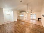 This home features an open living area with vaulted ceilings and a fireplace, a functional kitchen connected to the main living space, and a spacious primary suite with direct backyard access. Outside, enjoy a private corner-lot yard with mature trees!