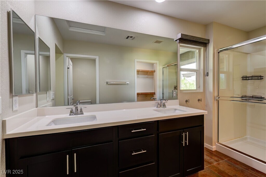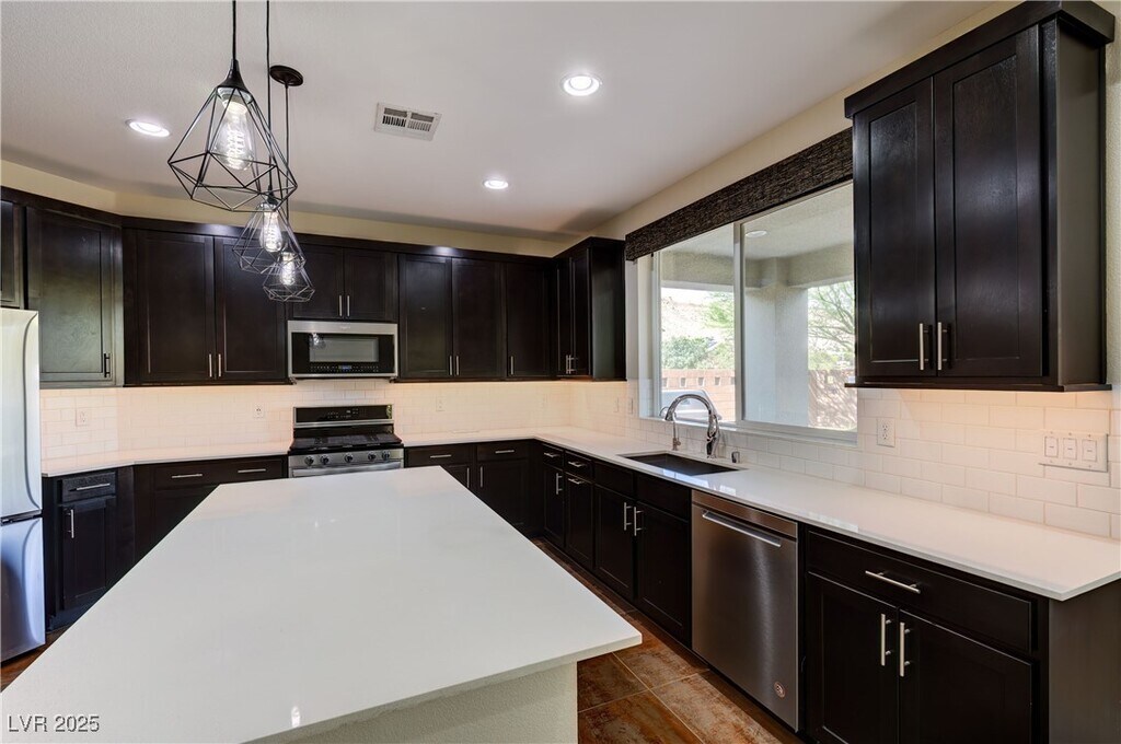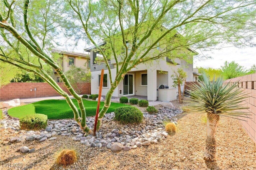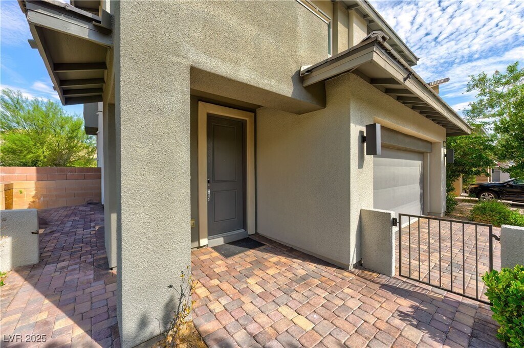 South Summerlin Former 6 year old model home in exclusive gated community has 3 bedrooms, 2.5 baths in an open floor plan. Corner lot with open space behind it, 180 degrees great mountain views, contemporary kitchen, rich java cabinets, quartz countertops & white subway backsplash accents. Stainless appliances, 5 burner gas range w/microwave above, large kitchen island w/ storage. Livingroom is spacious open to dining area. Covered patio has outdoor BBQ w/prep area. Professionally landscaped easy care fenced yard boasting mountain views. Huge Master bedroom with covered patio overlooking mountain views. Master bath is spacious, double vanity, large walk-in shower & walk in closet. Two additional bedrooms are ample sized, light & bright. Second upstairs bath has double vanity & lot of linen storage. Upgraded laundry room with sink, storage cabinet, washer & dryer. Double car garage has epoxy floor. Close to Bishop Gorman HS, Two Gradeschools, Minutes to Groceries, Shops and Restaurants.