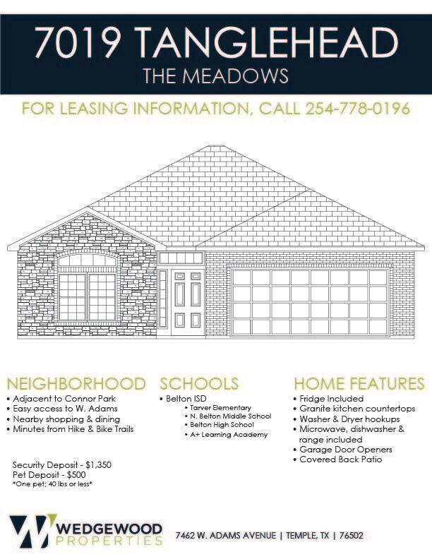 Coming Soon! Beautiful 3 bedroom, 2 bath home available mid - December 2025 for move in. Located in West Temple and BISD ISD right off West Adams. This home is minutes away from the Westfield Market where many restaurants and shops await. This single-family home features open concept kitchen (including all appliances: fridge, dishwasher, microwave & stove) with eat at bar, designate dining area-all open to the spacious living room. Carpet only in the bedrooms, wood vinyl in living/kitchen and tile in bathrooms. Master bedroom features tray ceiling with ceiling fan, private bath with large walk in shower, ample closet space and double sink vanity. Large backyard with privacy fence & NO rear neighbors! *Photos from similar home and may be a mirrored layout* Application fee $50 per applicant Pre-Approved pets are welcome- additional deposits Rent $1750 with $1500 security deposit Call for showings or more information at Wedgewood Properties or email: BISD: Pirtle Elementary, North Belton Middle School, Lake Belton High School (verify before applying)