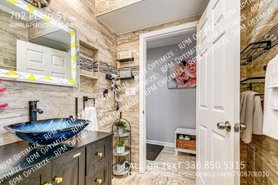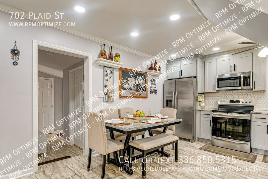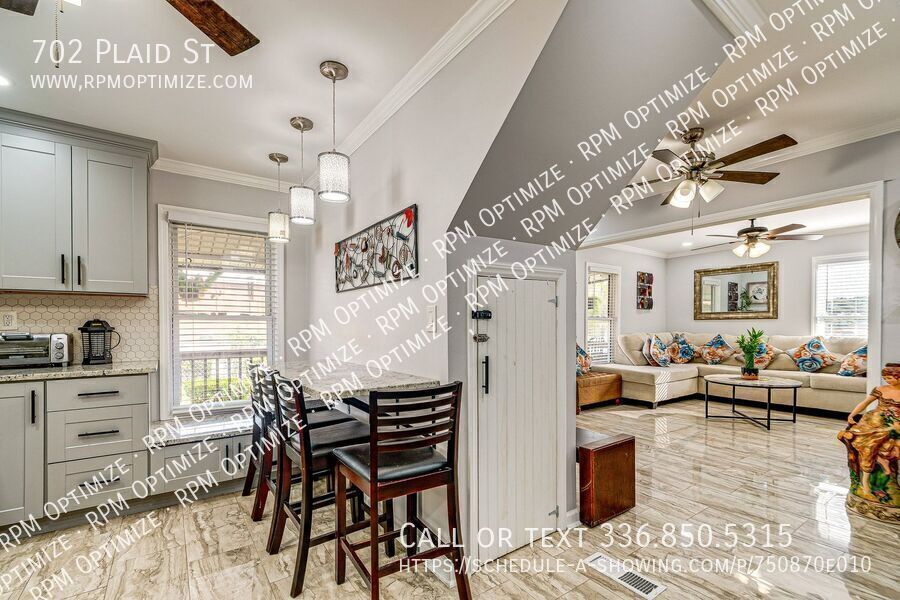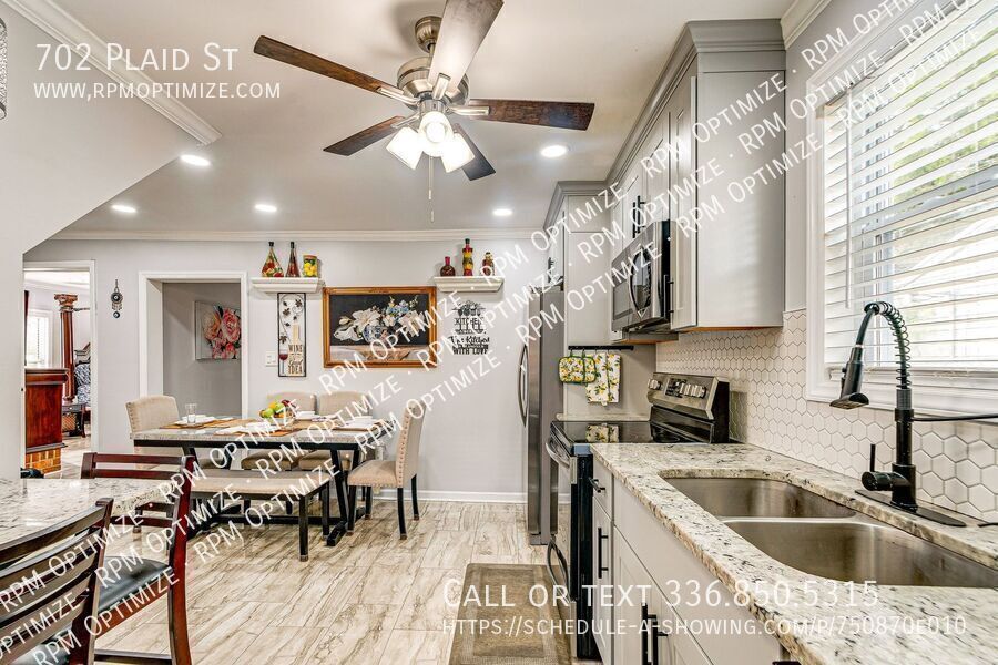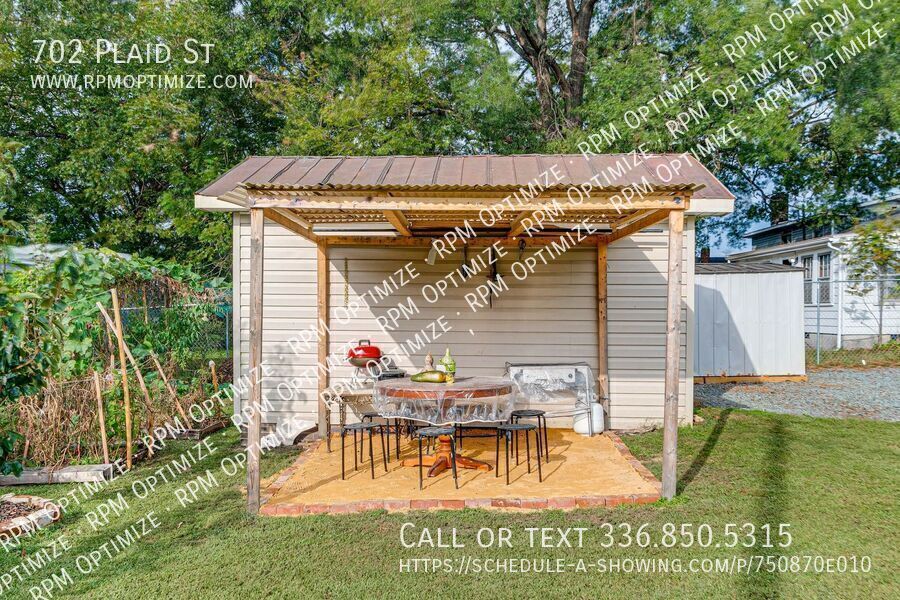This charming two-story home blends modern updates with timeless character, just minutes from downtown Burlington. Situated on a spacious corner lot with a fenced yard, this property offers both comfort and convenience. Inside, you’ll find a thoughtfully renovated interior featuring polished river marble tile throughout the main level and original brick decorative fireplaces that add character. The updated kitchen is equipped with granite countertops, stainless steel appliances, a breakfast bar, and a dedicated dining area, perfect for everyday living and entertaining. The primary bedroom is conveniently located on the first floor, while two additional bedrooms upstairs feature comfortable carpeted flooring. The fully updated bathroom showcases upscale finishes, modern tilework, and a glass shower. Additional features include in-unit laundry, keyless entry, central air and gas heat, and ceiling fans throughout. Step outside to enjoy a large fenced yard with space to relax, garden, or entertain, complete with fruit trees, rose bushes, a grilling area, a storage shed, and a gravel driveway for parking. Any or all furnishings can be included at no additional cost. This home offers a rare combination of style, space, and character, homes like this don’t stay available for long. One-year lease required. No smoking. No pets. Showings by appointment only. Deposit-free move-in options are available through Obligo for qualified applicants, and all residents are enrolled in the $35/month Resident Benefits Package. AVOID RENTAL SCAMS: Real Property Management Optimize exclusively markets this listing and will never request wire transfers or app payments. Additional Storage Corner Lot Downstairs Primary Bedroom Driveway Parking Front Porch Glass Shower Keyless Entry Kitchen Dining Area Large Fenced Yard Living Room Television Included Two Story