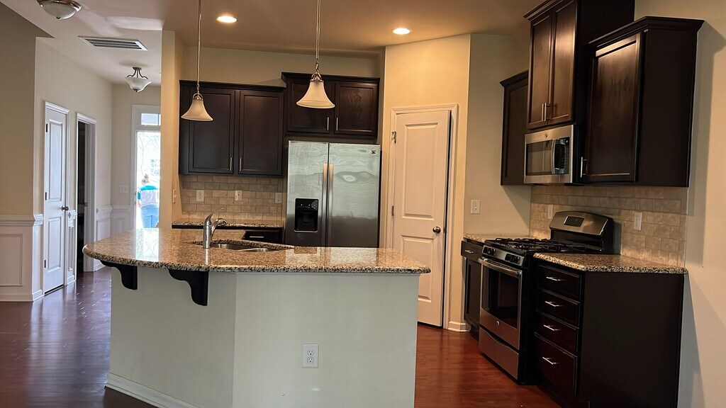 Very great 3 bedroom town home with hardwoods throughout first floor, granite counters, tile back splash, 9 ft. ceilings up and down,separate tub and shower in owner's suite. Big size covered patio backing to wooded buffer. Right in RTP, the most desiarable location.All appliances included.