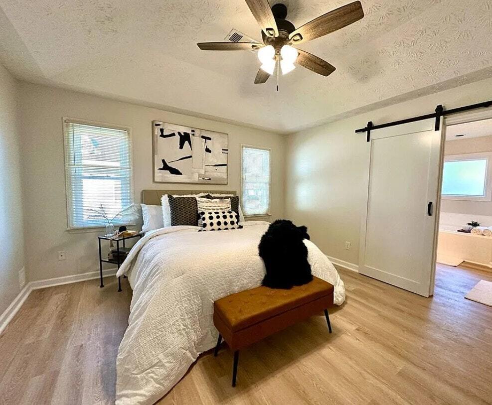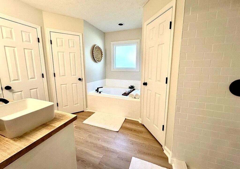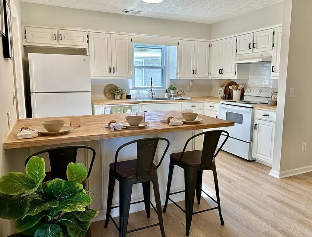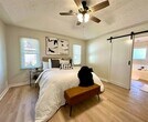 Cozy renovated 3 bedroom, 2 bath ranch home featuring luxury vinyl flooring and updated electrical and plumbing fixtures throughout. The kitchen offers butcher block countertops, a farmhouse stainless sink, bar seating, and a dining area with French doors leading outside. The foyer opens to a spacious family room with a cathedral ceiling and brick fireplace. The master suite includes a specialty ceiling and barn-door entry to a private bath with butcher block counters, dual vessel sinks, a tile walk-in shower, whirlpool tub, and his-and-her closets. One guest bedroom features a vaulted ceiling with abundant natural light, while the second guest bedroom provides generous closet space. A full hall bath includes a butcher block vanity, vessel sink, tub/shower combo, and new black fixtures. The laundry room with shelving leads directly to dual covered parking.