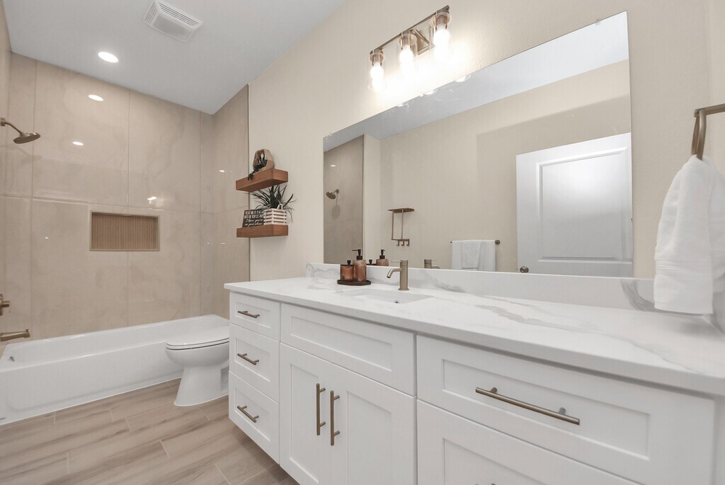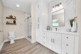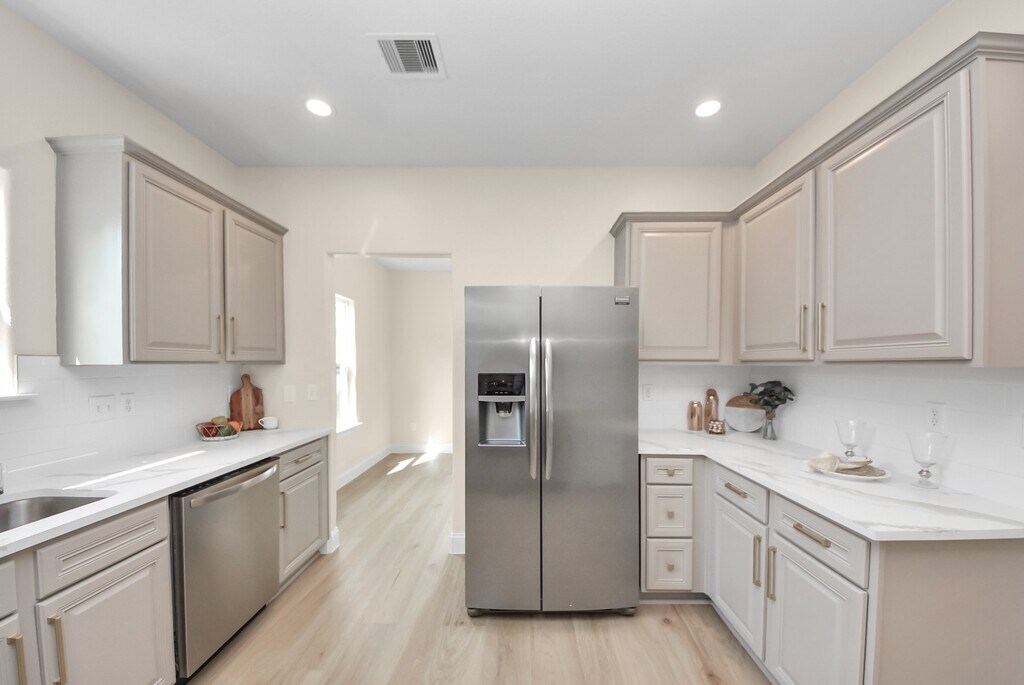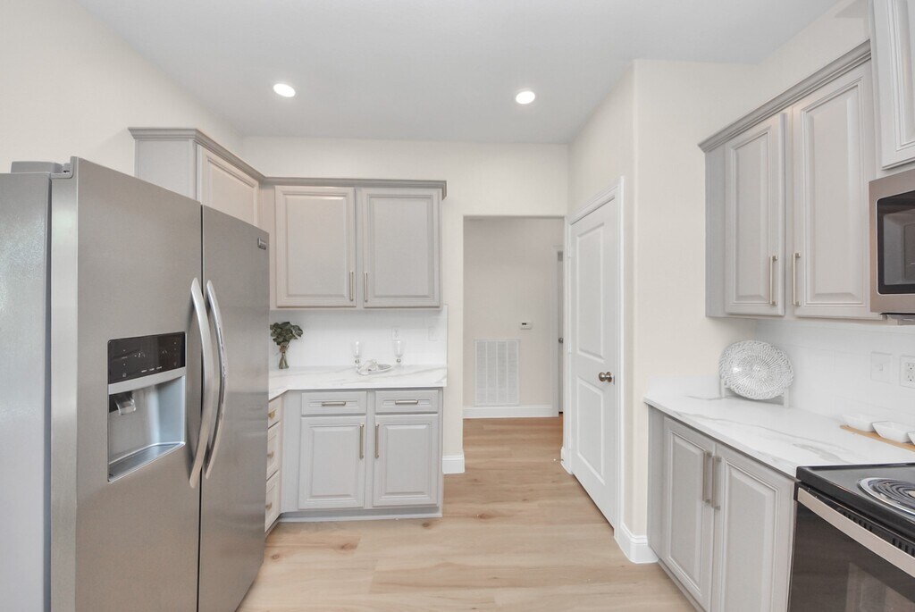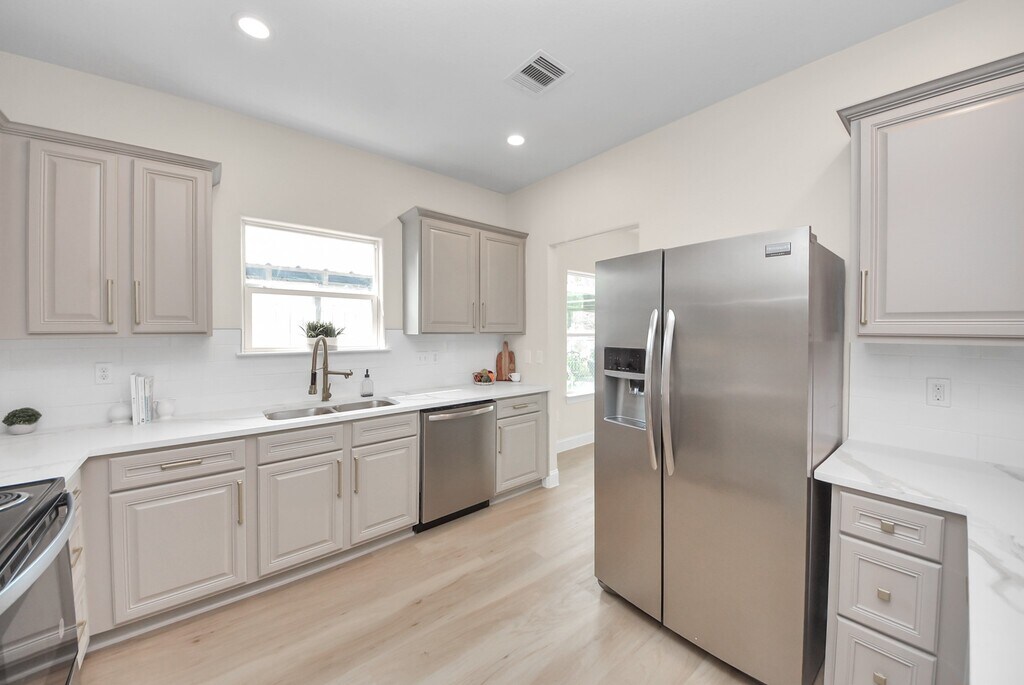 Indulge in this beautifully renovated,energy-efficient 2013 build home,showcasing modern comfort and elegant design. Featuring a brand-new HVAC system,Low-E double-pane windows,blown-in insulation,9ft-ceilings,PEX piping,recessed lighting,a spacious walk-in laundry room,and an oversized driveway. The kitchen offers custom-style cabinetry with gold hardware,NEW Calcutta Gold quartz countertops,and stainless-steel appliances. Throughout the home,enjoy waterproof luxury vinyl plank flooring that blends durability with style. Unwind in the serene primary suite featuring a spa-inspired bathroom with LED-lit niches and a generous walk-in closet. This home features all-electric utilities,eliminating the need for gas service and helping reduce overall energy cost. The property has never flooded and is ready for immediate move-in. MLS# 69099120