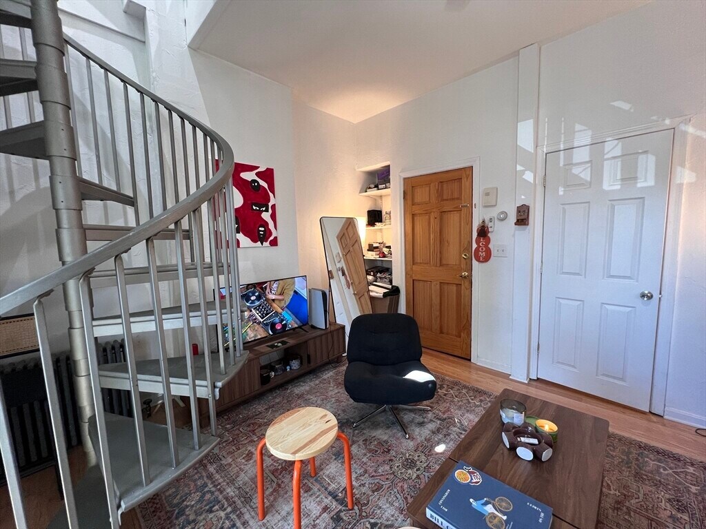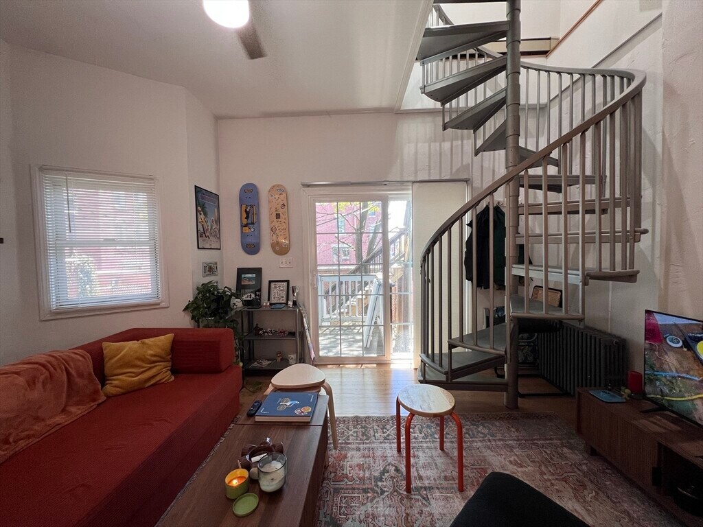 Live on highly desirable East Broadway in the heart of it all! This unique unit is tucked away behind the commercial space so you get all the convenience of walkability paired with quiet and serene living. Off of your living room you get a lovely private back deck and patio. The queen sized bedroom features a walk through closet with room for a dresser as well. Up the winding staircase you'll find a spacious kitchen with a second private deck and a full sized bathroom. Card swipe laundry and extra storage in the basement. Right outside your door you have Playwright,The Broadway,Paramount,Stop n Shop,Starbucks,multiple MBTA Bus stops,Medal of Honor Park and so much more! Don't miss this wonderful opportunity! Available 9/1. No pets. MLS ID 73508413