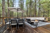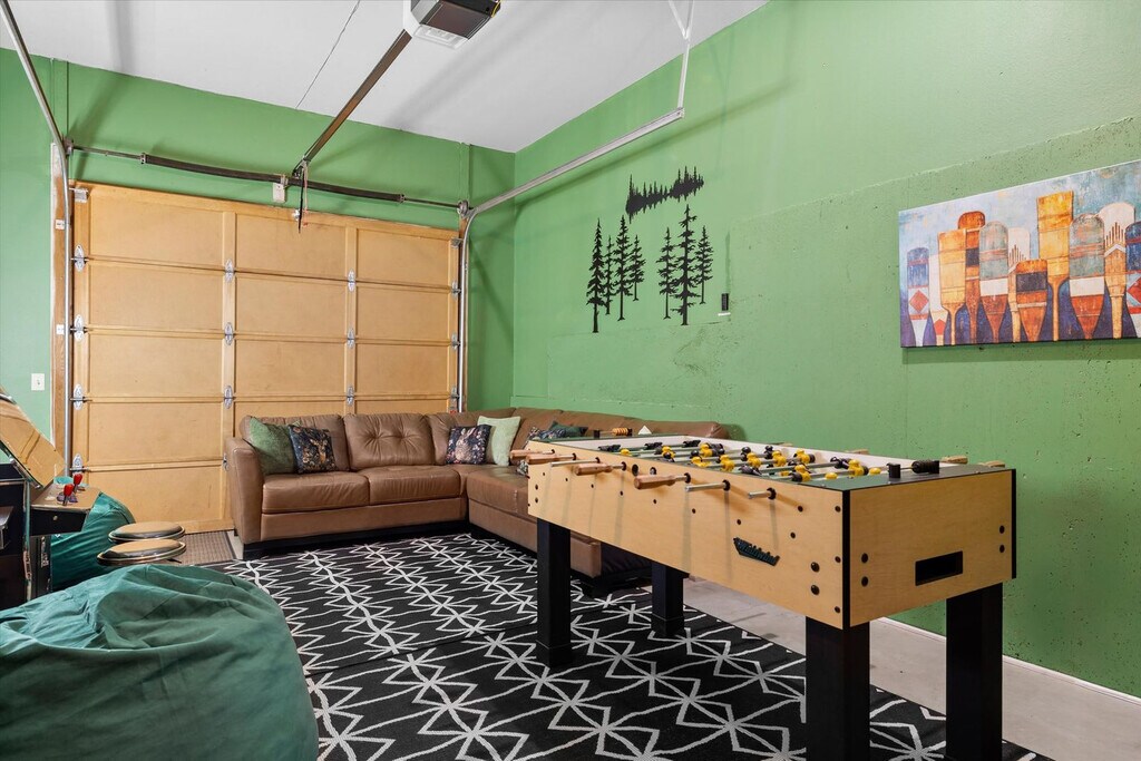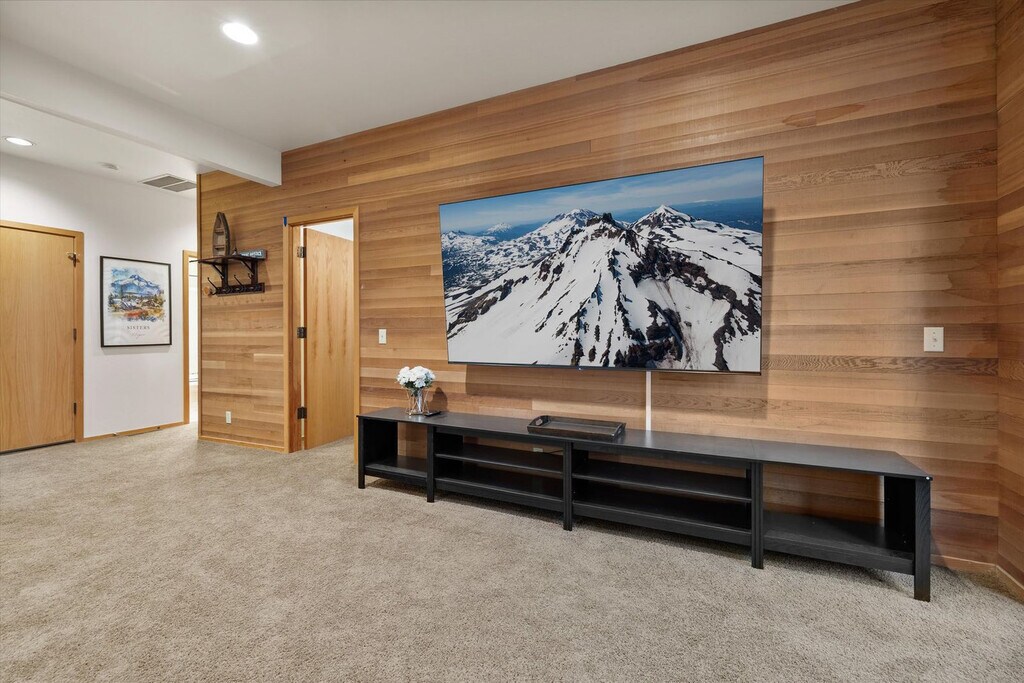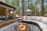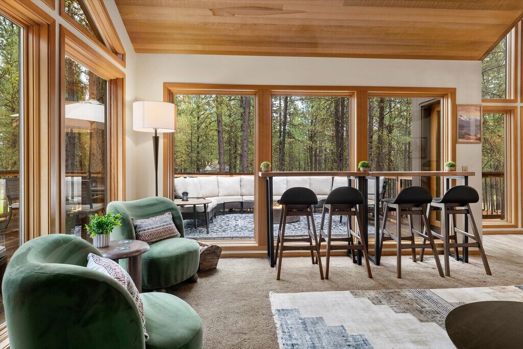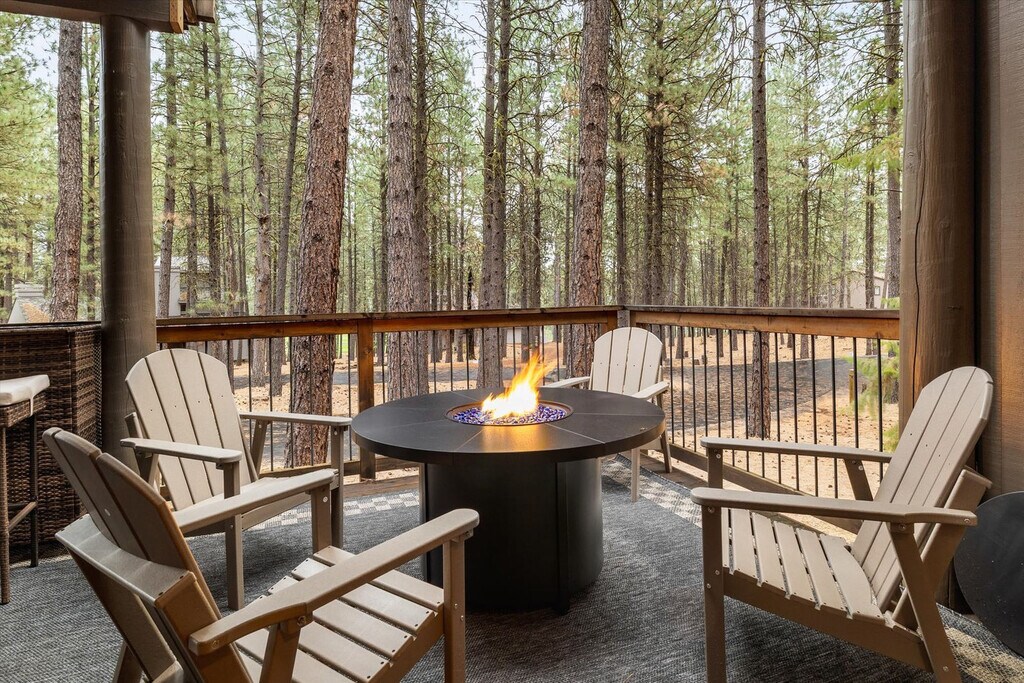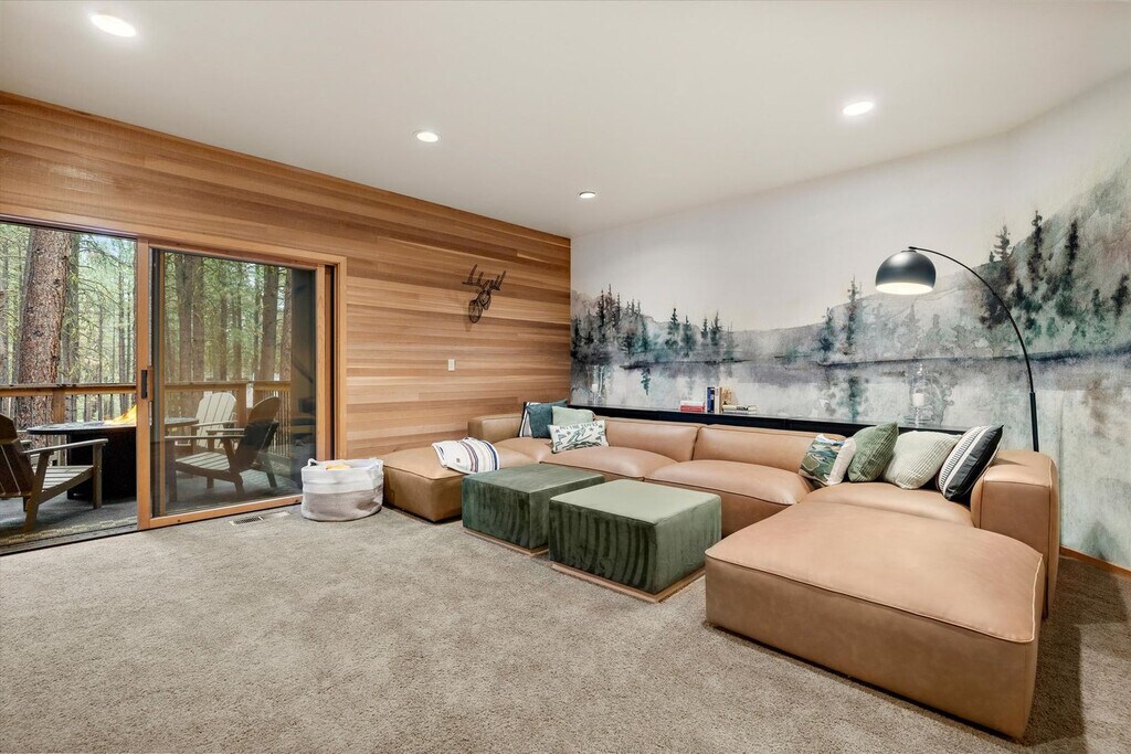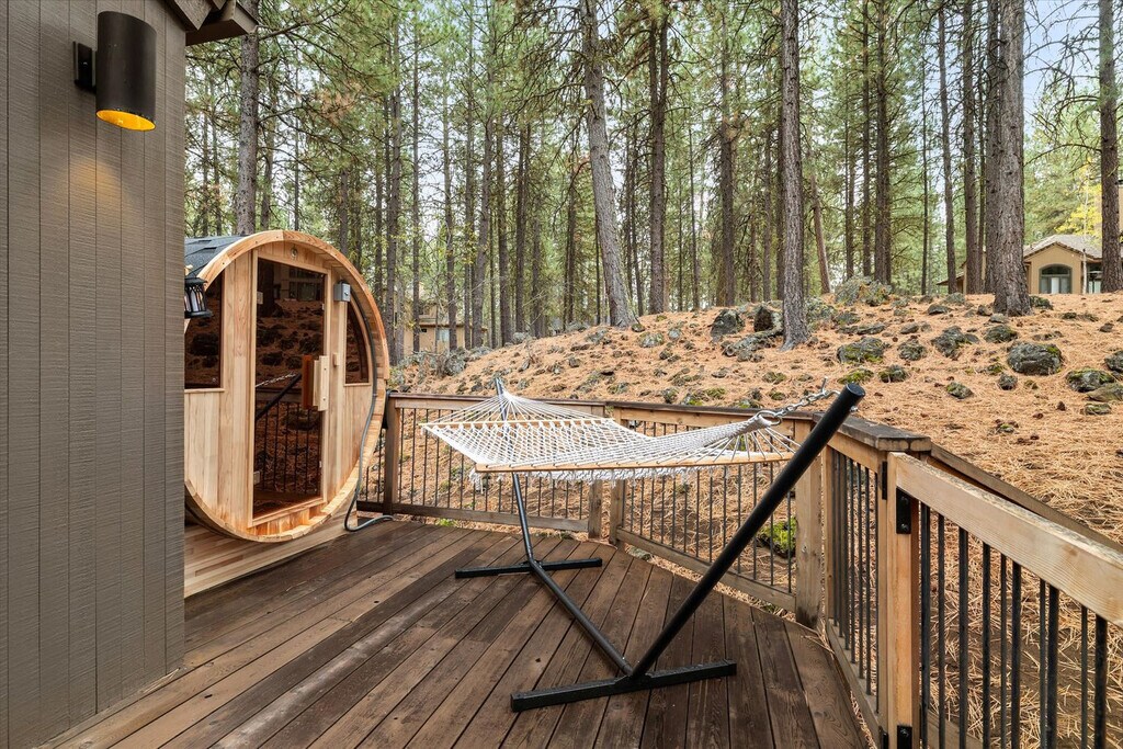 Feel at home in The Treehouse Cabin at Black Butte Ranch, a 4-bedroom, 3-bathroom retreat that sleeps up to 15. This cabin offers a blend of modern luxury and Oregon wilderness charm. This home features a fully stocked chef’s kitchen with high-end stainless appliances, a coffee and espresso bar plus a hot cocoa station, a game room with foosball, arcade games, and a PlayStation 5, and a movie theater. Enjoy the outdoor decks with swings and a hammock, two gas fire pits, a hot tub, and a barrel sauna. Kid-friendly amenities include two themed playrooms, kids' utensils, plates and cups, toy trucks, a kids' step stool, two memory foam pull-out beds, kids' books, a pack 'n play, a wood tea set, a high chair, and a Snoopy waffle maker. Up to 2 dogs are allowed for $125 per stay. Located steps from Glaze Meadow Golf Clubhouse and a short stroll to the resort pool, The Treehouse Cabin provides access to Black Butte Ranch’s world-class amenities, including indoor and outdoor pools, hot tubs, tennis courts, a fitness center, scenic trails, horseback riding, and Phalarope Lake for kayaking and paddleboarding. Nearby attractions include Glaze Meadow Golf Course (0.5 miles), Black Butte Ranch Biking & Hiking Trails (on-site), Phalarope Lake (1 mile), Downtown Sisters (8 miles), and Black Butte Trailhead (5 miles). Check-in is at 4pm and check-out is at 10am. No cats are allowed. Guests must be 21 years or older to book this property. No parties are allowed, and violations may result in immediate termination of the stay. Guests are kindly asked that their dog is crate trained and that they pick up after their dog. Includes high-speed Wi-Fi and two workspaces. [SI]