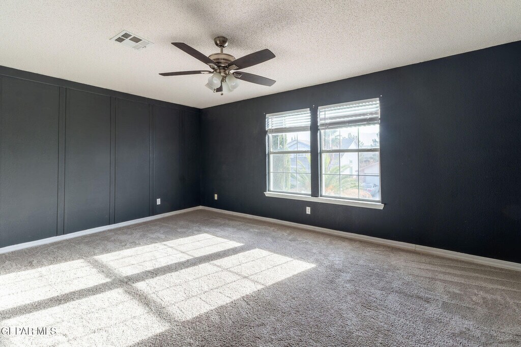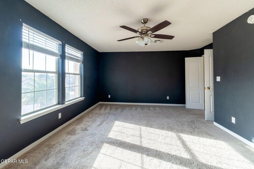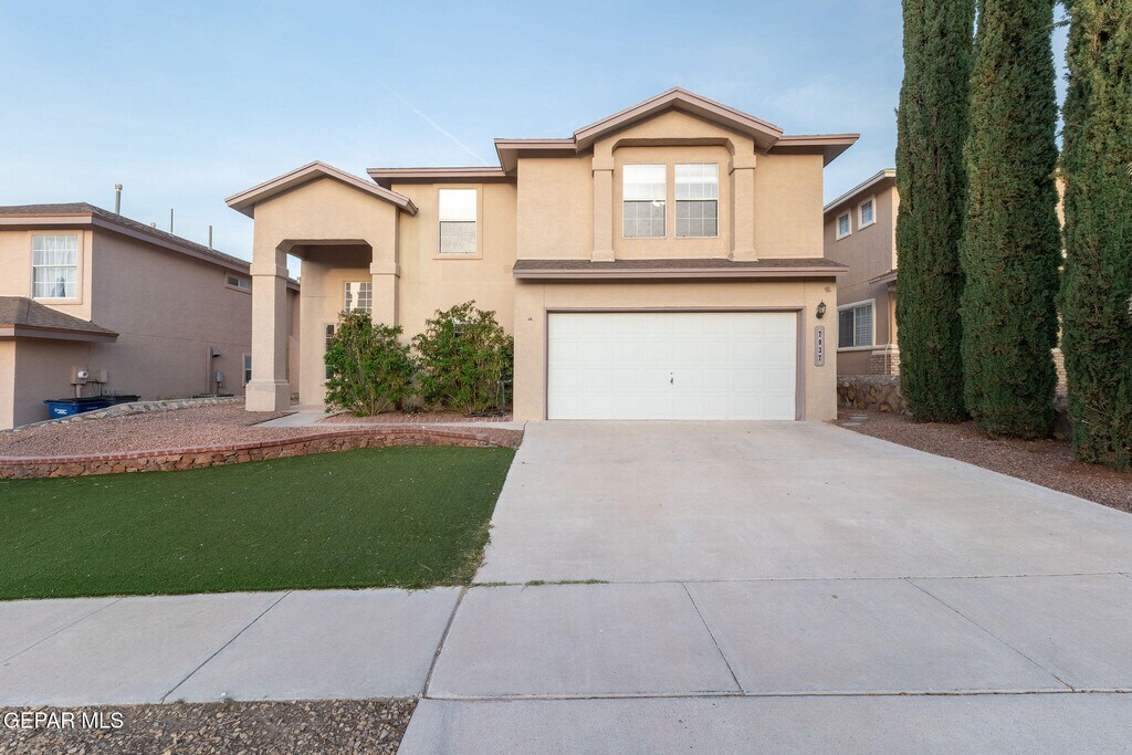 Well-maintained 5-bedroom,2.5-bath home offering 2,554 square feet of living space,built in 2001 and located on the Westside of El Paso. The kitchen was upgraded in 2023 and provides generous cabinet and drawer storage,two large pantries,and an oversized granite peninsula suitable for everyday use and entertaining. Hardwood-look tile flooring runs throughout the downstairs living areas. A dedicated office is located on the first floor,offering flexibility for remote work,study,or additional living space. Upstairs features 5 carpeted bedrooms and travertine-finished bathrooms. The primary suite was renovated in 2023 and includes a clawfoot soaking tub,walk-in shower with an arched glass divider separating the shower and vanity area,double vanities,travertine flooring,and a separate water closet. The backyard includes a swimming pool and spa with heater. Bi-weekly professional pool service is included. Solar panels help support energy efficiency.