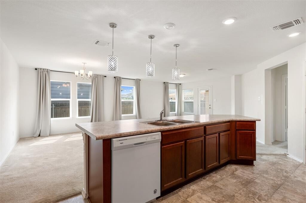 Only a few years old, this 1 story home is ready for you! Featuring an open-concept living/dining/kitchen with an enormous island and breakfast bar, the kitchen also has a large pantry, built in microwave, range, & dishwasher. Lots of natural light fill the primary bedroom, which also has a huge walk-in closet, full bathroom with double vanity, linen closet, and a shower/tub combo. A true mother-in-law plan, the guest bedrooms are separated from the primary bedroom and share a full bath. Two car garage with opener, water softener, curtains, and electric dryer outlet