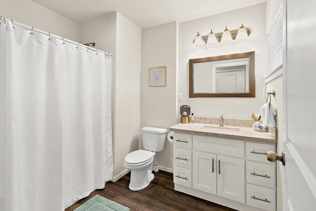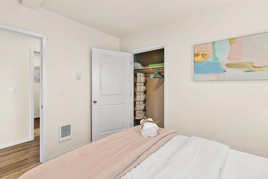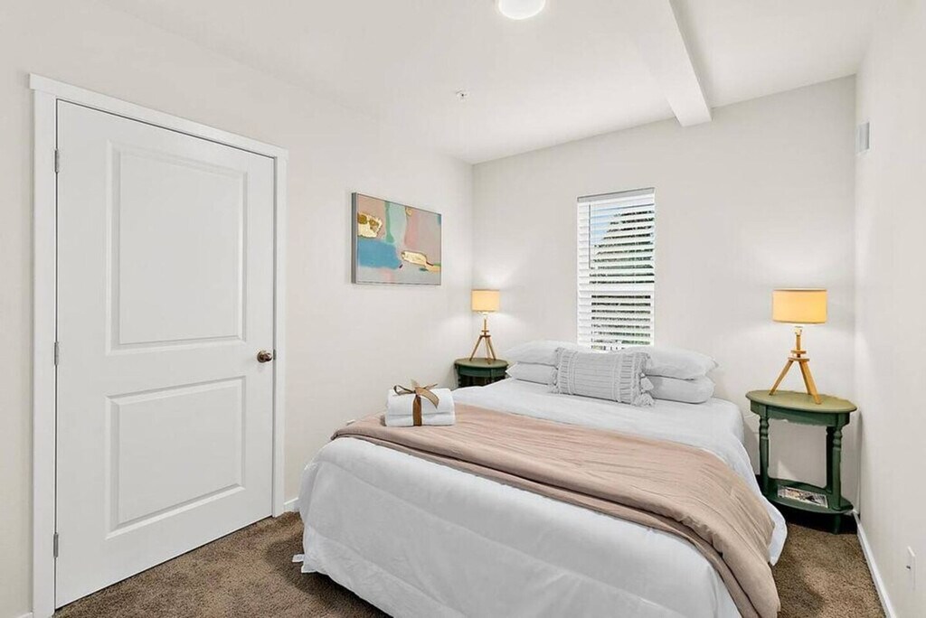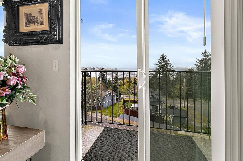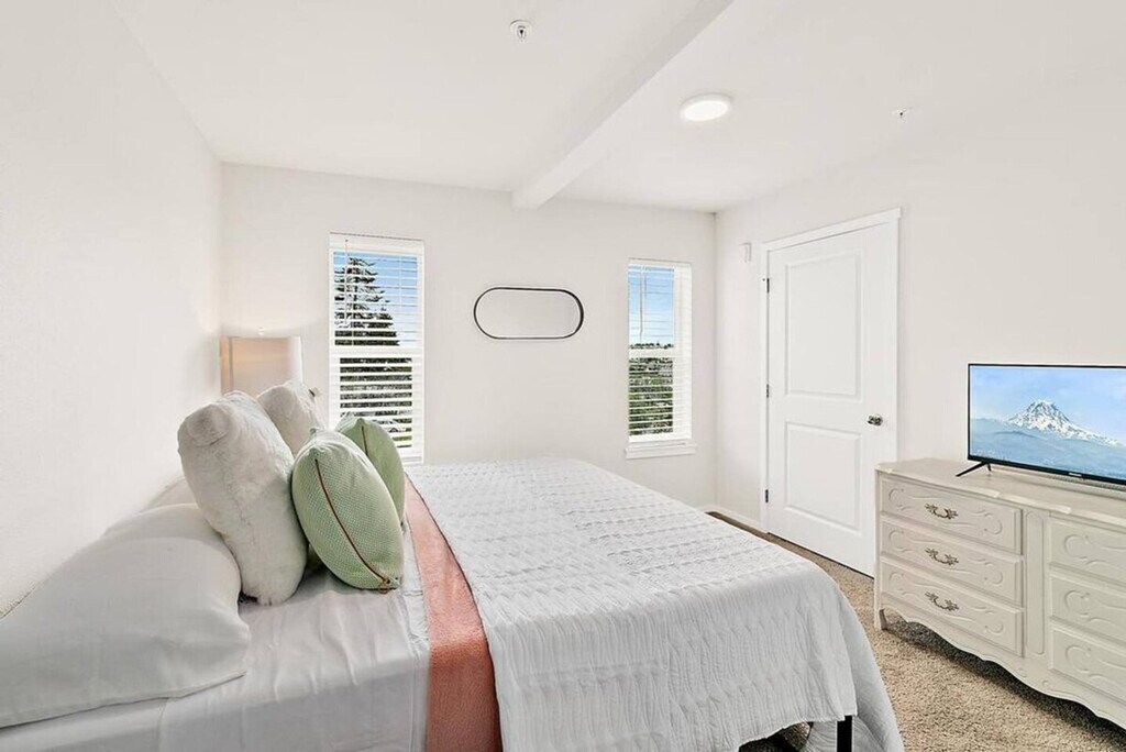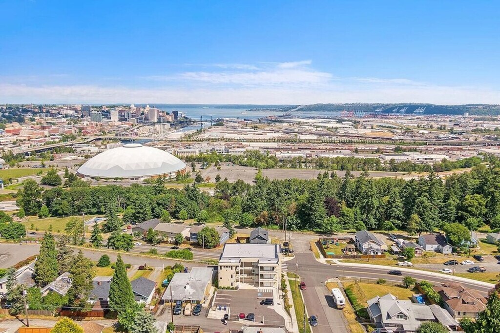 Experience the charm of Tacoma with this top-floor corner condo offering stunning views of Commencement Bay and the Tacoma skyline. Located just steps from the Tacoma Dome, this home provides a peaceful retreat on a quiet street in the Tacoma Dome neighborhood. Please note, access to this condo requires climbing three flights of stairs as there is no elevator. This spacious condo features an open floor plan with two private bedrooms and 1.5 baths, comfortably accommodating up to four people. Enjoy plush down bedding with one king-size and one queen-size bed, spacious closets, and tasteful decor. The kitchen boasts sparkling white granite countertops and stainless steel appliances, fully stocked with everything you need from cookware to coffee. The bathroom is equipped with towels, shampoo and conditioner, and all basic toiletries. Additionally, there is an in-unit washer and dryer, complete with laundry detergent, dryer sheets, and an iron and ironing board. Reserved parking is included with your stay, ensuring convenience and ease during your visit. Nestled in the Tacoma Dome neighborhood, this condo offers breathtaking views of Commencement Bay and the downtown Tacoma skyline. Its prime location places you steps away from the Tacoma Dome and provides easy access to the vibrant city life of downtown Tacoma. The building features controlled access with a keyless lobby and condo door, making entry simple and secure. Relax in the living area with some popcorn and Netflix, or enjoy a meal at the dining table for four. [SI]