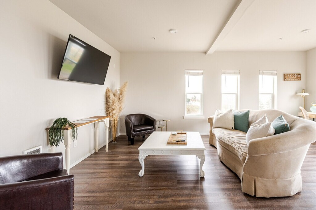 The advertised rate of $3,955/month is the lowest available price, based on a 1 month(s) stay with a move-in date of April 19, 2026. Rates vary depending on the duration of stay, season, and other parameters. For exact pricing and additional pricing components, please visit our website and enter your desired move-in and move-out dates. The rate is applicable when billed upfront; it can be higher if billed in multiple payments. Experience the charm of Tacoma with this top-floor corner condo offering stunning views of Commencement Bay and the Tacoma skyline. Located just steps from the Tacoma Dome, this home provides a peaceful retreat on a quiet street in the Tacoma Dome neighborhood. Please note, access to this condo requires climbing three flights of stairs as there is no elevator. This spacious condo features an open floor plan with two private bedrooms and 1.5 baths, comfortably accommodating up to four people. Enjoy plush down bedding with one king-size and one queen-size bed, spacious closets, and tasteful decor. The kitchen boasts sparkling white granite countertops and stainless steel appliances, fully stocked with everything you need from cookware to coffee. The bathroom is equipped with towels, shampoo and conditioner, and all basic toiletries. Additionally, there is an in-unit washer and dryer, complete with laundry detergent, dryer sheets, and an iron and ironing board. Reserved parking is included with your stay, ensuring convenience and ease during your visit. Nestled in the Tacoma Dome neighborhood, this condo offers breathtaking views of Commencement Bay and the downtown Tacoma skyline. Its prime location places you steps away from the Tacoma Dome and provides easy access to the vibrant city life of downtown Tacoma. The building features controlled access with a keyless lobby and condo door, making entry simple and secure. Relax in the living area with some popcorn and Netflix, or enjoy a meal at the dining table for four. [SI]