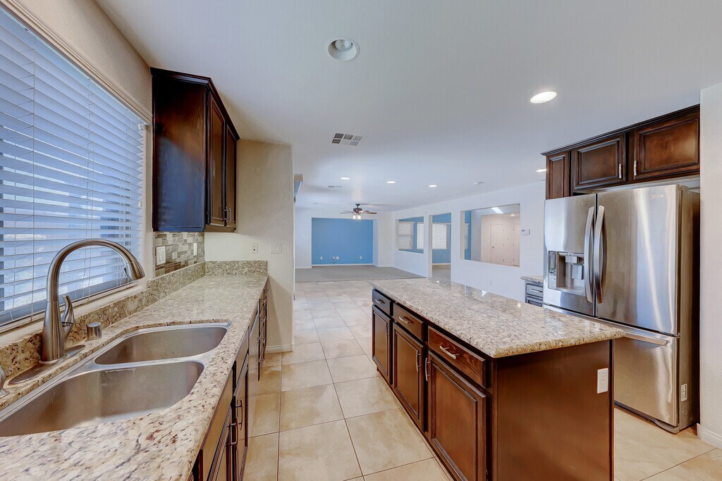 THIS BEAUTIFULLY APPOINTED LARGE 5 BEDROOM HOUSE HAS IT ALL. FEATURES TO INCLUDE: TILE FLOORING THROUGHOUT, CARPET IN BEDROOMS, 2 SEPARATE FAMILY ROOMS, KITCHEN WITH LARGE ISLAND, GRANITE COUNTERTOPS, STAINLESS STEEL APPLIANCES, BUILT IN MICROWAVE, WASHER AND DRYER INCLUDED, DOWNSTAIRS BEDROOM WITH BATH, PRIMARY SUITE WITH WALK IN CLOSET SEPARATE TUB AND SHOWER, ALL BEDROOMS WITH PLENTY OF CLOSET SPACE, CEILING FANS, BLINDS, LARGE UPSTAIRS LOFT AREA, DESERT LANDSCAPING, COVERED PATIO, COMMUNITY PARKS AND RECREATIONAL ACTIVITIES.