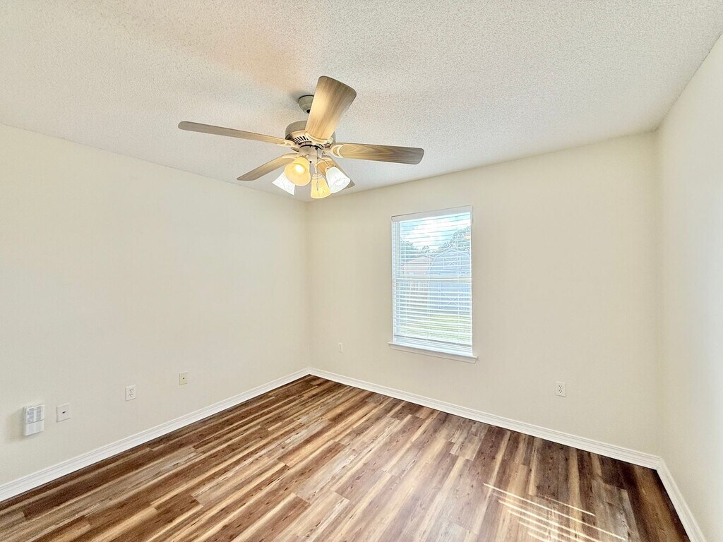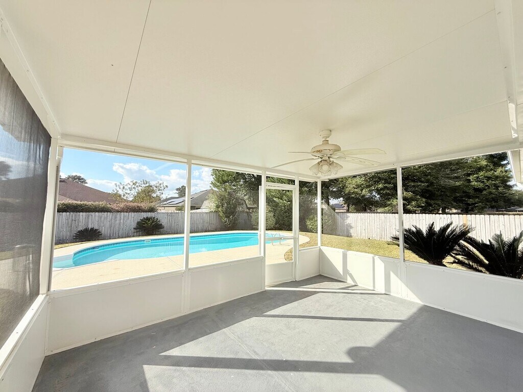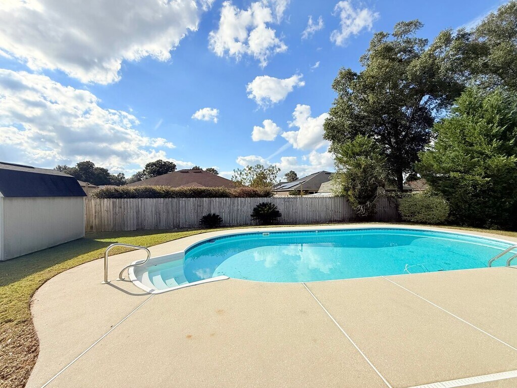 View In 3D: Welcome to this charming 3-bedroom, 2-bath home featuring an open, split floor plan designed for comfort. Located in the desirable Harvest Point subdivision, this property is just minutes from NAS Whiting Field. The spacious kitchen boasts granite countertops, a large center island, and stainless steel appliances, including a side-by-side refrigerator, dishwasher, flat-top oven/range, and a built-in microwave. The primary suite offers a ceiling fan for added comfort, and an ensuite bathroom with dual vanities, standing shower, and separate garden tub. Two additional bedrooms share a second full bath with single vanity and tub/shower combo. Step outside to enjoy the screened-in back porch, and the fully-fenced backyard complete with a refreshing inground pool and spacious storage shed. Additional highlights include a formal dining room, a dedicated laundry room with space for a full-size washer and dryer, a two-car garage, and low-maintenance LVP flooring throughout the home.