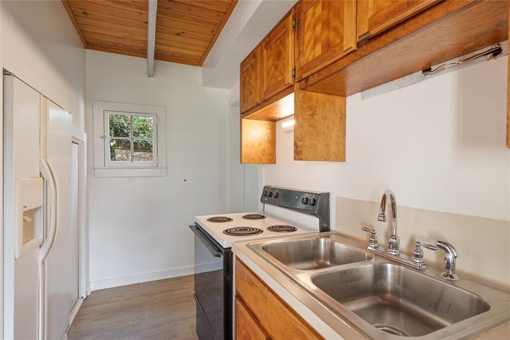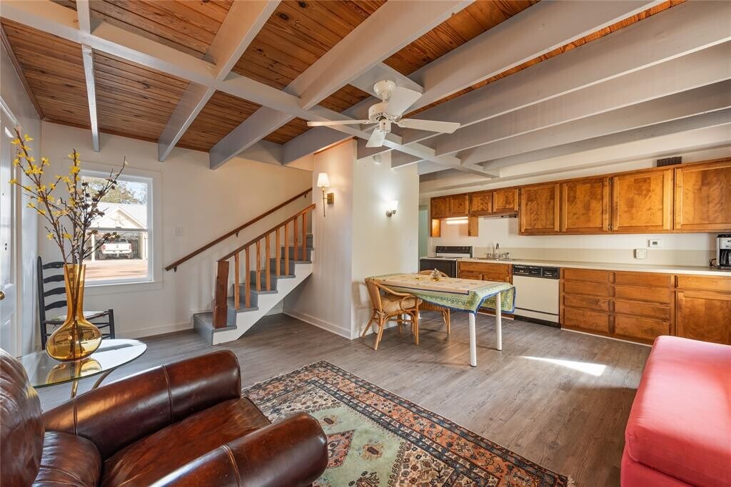 Live in a truly unique piece of Bastrop history! All utilities and yard maintenance are included with this 1892 Victorian carriage house that sits on a generous 0.65-acre corner lot in the heart of Historic Downtown Bastrop, just steps from restaurants, shops, the Fisherman’s Park, and all the charm of downtown living. Fully detached and one of three historic structures on the property, the carriage house offers privacy, character, and comfort with no carpet, abundant natural light, exposed beams, and original pine ceilings. Inside, you’ll find two bedrooms, both located upstairs; one functions as a loft-style space with its own closet and serves as a walk-through room to the primary bedroom. A full bath is located upstairs, while a half bath is conveniently situated downstairs. The open kitchen and living area create a warm, inviting space, and the home also includes a recently updated laundry room with a washer and dryer. Tenants enjoy use of the shared, lushly landscaped yard, with all exterior maintenance included. There is also an option to lease the home fully or partially furnished, with pricing available upon request. If you love historic homes, walkability, and a private garden compound tucked into downtown Bastrop, this carriage house is a rare and wonderful find.
