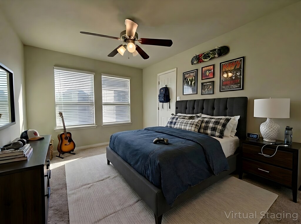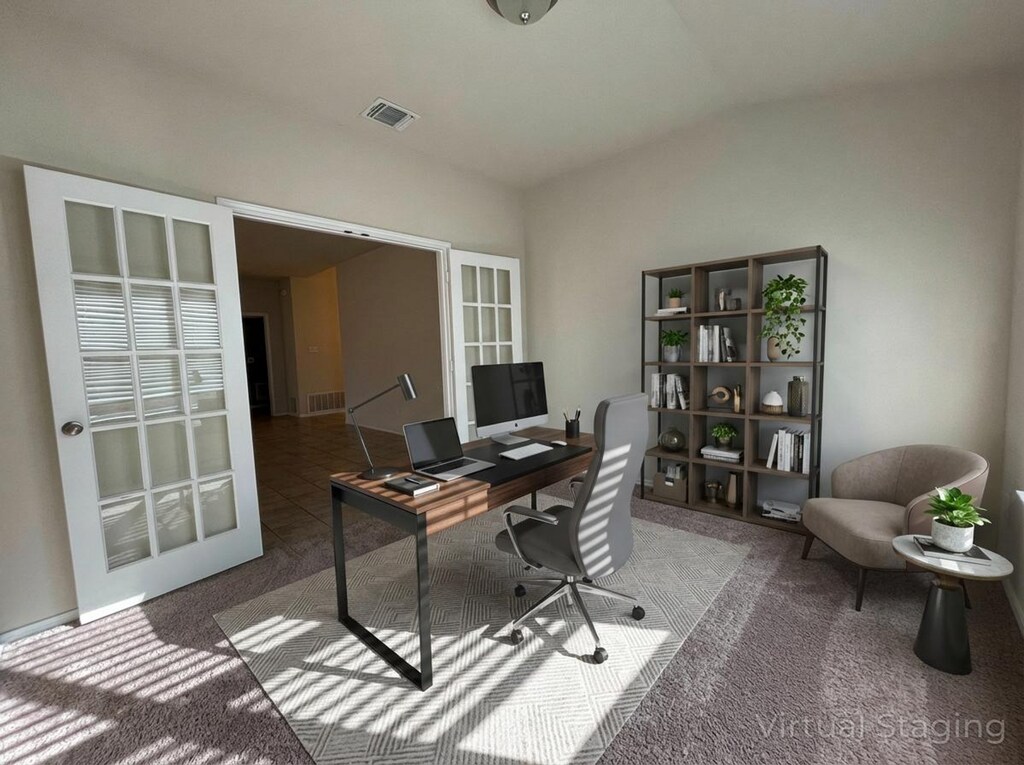View 360° virtual tour: Welcome to this impressive 2,150 square foot home located in the Splawn Ranch community. This thoughtfully designed property offers 4 bedrooms, 2 bathrooms, a spacious living room, and a dedicated office with elegant French doors. The kitchen is fully equipped with a glass top stove, double ovens, built-in microwave, side-by-side refrigerator, dishwasher, garbage disposal, double sink, pantry, and an eat-in dining area, making it ideal for both everyday living and entertaining. The primary bedroom is generously sized to accommodate larger furniture and includes a ceiling fan for added comfort. The primary bathroom features double sinks, a large vanity mirror, a separate shower, a linen closet, and a relaxing garden tub. Secondary bedrooms offer comfortable carpeted flooring and share a full bathroom. Outside, enjoy a covered patio, a spacious backyard with a wood privacy fence, and a 10x10 storage shed that provides extra storage space. Appointments aren’t required to tour. Contact us or stop by our Killeen office to learn more and see this home in person once it becomes available! We are located at 1020 W Jasper Dr, Killeen, TX 76542. Disclaimer: The furnishings or enhancements shown are AI-generated and intended for inspiration only. They may not reflect the actual scale, condition, or current features of the property.