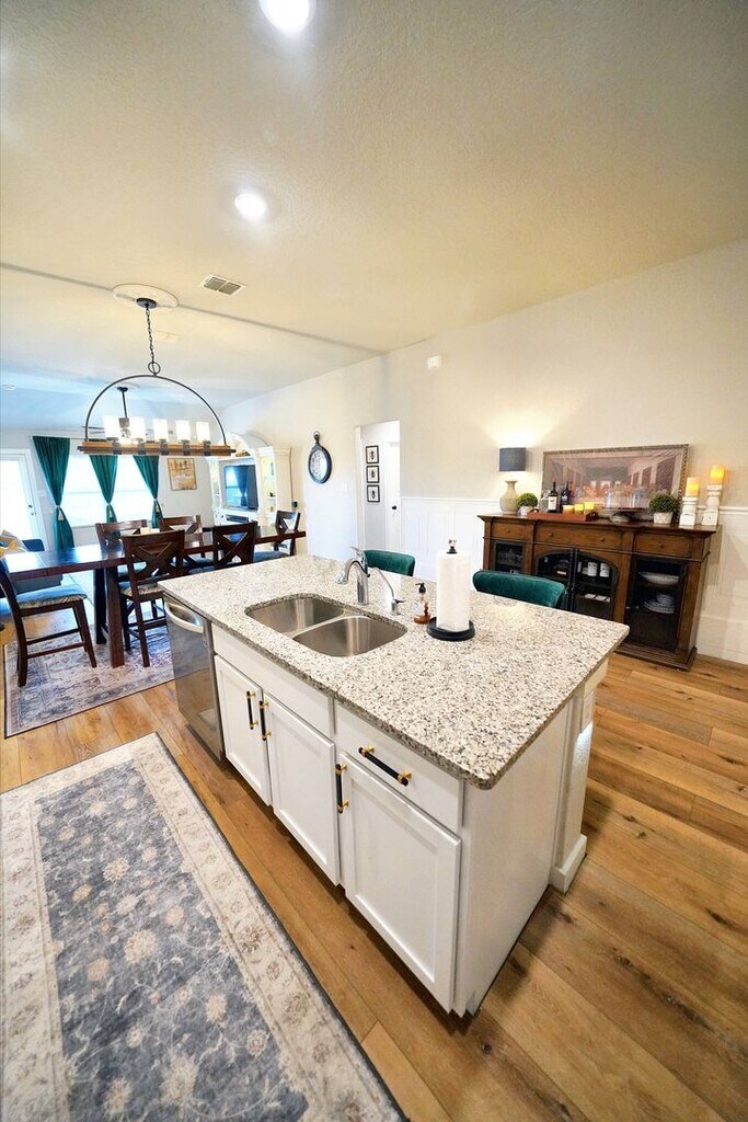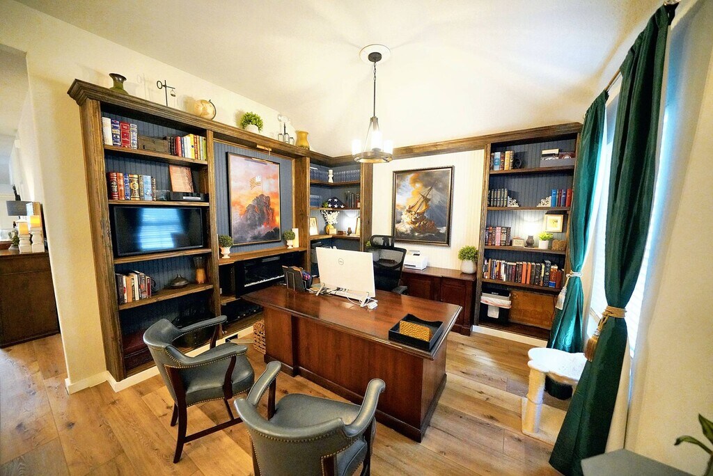 Immaculate, upgraded single-story home in the desirable Vista Ridge subdivision of North East San Antonio. This 3-bedroom, 2-bathroom home invites you in through an oversized entryway, leading to stunning vinyl plank flooring that flows throughout. A cozy room off the entry features a charming electric fireplace framed by custom built-in bookshelves, creating a perfect spot to relax. The open-concept layout seamlessly connects the kitchen, dining area, and family room-ideal for hosting gatherings. The modern kitchen boasts upgraded solid-surface countertops, shaker-style cabinetry with custom hardware, stainless steel appliances, gas cooking, and a large eat-in island, perfect for casual dining or morning coffee. The private master suite is thoughtfully separated from the secondary bedrooms and includes a luxurious en-suite bathroom with dual vanities, a spacious walk-in shower, and an expansive walk-in closet. Both secondary bedrooms are generously sized and equipped with ceiling fans for comfort. Step outside to a covered patio that overlooks a serene greenbelt, offering a peaceful backdrop and added privacy. The backyard also includes a convenient storage shed. Located just minutes from I-35, Loop 1604, and The Forum, this home offers easy access to shopping, dining, and entertainment. Truly a must-see!