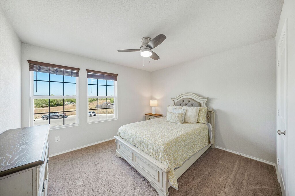 Nestled in the desirable Elm Valley Subdivision, this spacious two-story home offers a warm and inviting open floor plan, perfect for both relaxation and entertaining. The main living area flows seamlessly with wood laminate flooring, leading into a well-appointed kitchen featuring stainless steel appliances—including a gas stove and refrigerator—and solid countertops. Upstairs, the carpeted master suite includes a ceiling fan, tub/shower combo, single vanity, and a large walk-in closet. The convenience of a second-floor utility room with a full-size washer and dryer adds to the home’s functionality. Step outside to enjoy an oversized backyard complete with a patio, shed, and privacy fence, ideal for gatherings or quiet evenings. Additional features include a water softener and reverse osmosis system. Located near Lackland Air Force Base, major highways, shopping, and dining, this home combines comfort with a prime location.