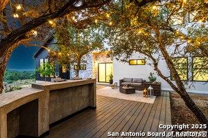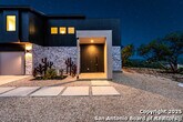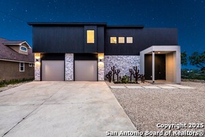 Set high on a hilltop in a quiet cul-de-sac, this new-build contemporary home offers privacy, space, and sweeping Hill Country views on a peaceful half-acre lot. Designed to inspire, the two-story layout features 4 bedrooms and 3 bathrooms with an open-concept floor plan, soaring ceilings, and abundant natural light throughout. The main level blends comfort and function with a spacious living and dining area centered around a modern fireplace, a flexible office or bonus room, and a refined kitchen with high-end Bosch stainless steel appliances. A first-floor bedroom provides an ideal guest suite or multi-generational living option, while the oversized two-car garage (21' x 25') adds generous storage. Upstairs, a versatile game room anchors the second level. Two secondary bedrooms share a full bath, while the private primary suite features a walk-in closet and an ensuite bathroom with a separate toilet room. Step onto the second-level terrace to enjoy breathtaking views-perfect for morning coffee or quiet evenings-while the lower deck with outdoor kitchen is designed for effortless gatherings and memorable moments with family and friends. Located in Timberwood Park, residents enjoy access to a private 30-acre park, stocked fishing lake, golf course, sports courts, pool, trails, fitness center, pavilion, and clubhouse, all within award-winning Comal ISD.