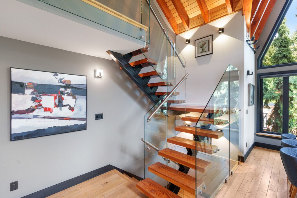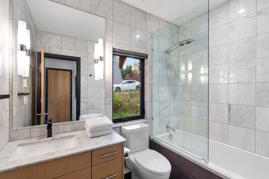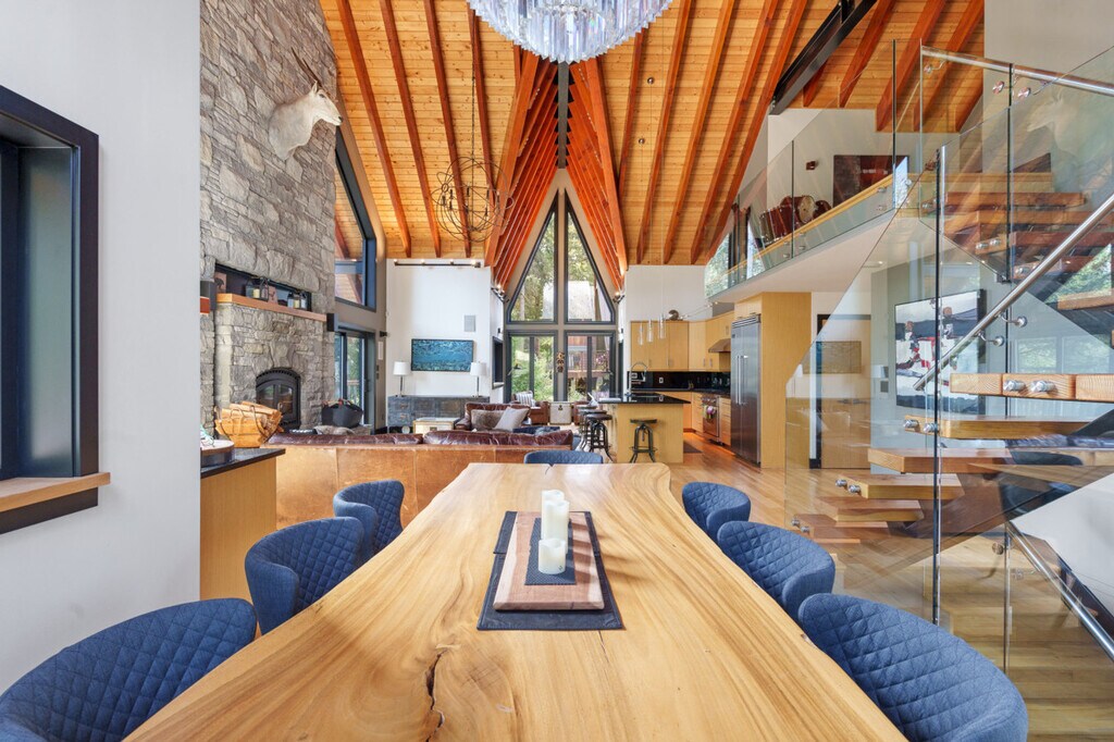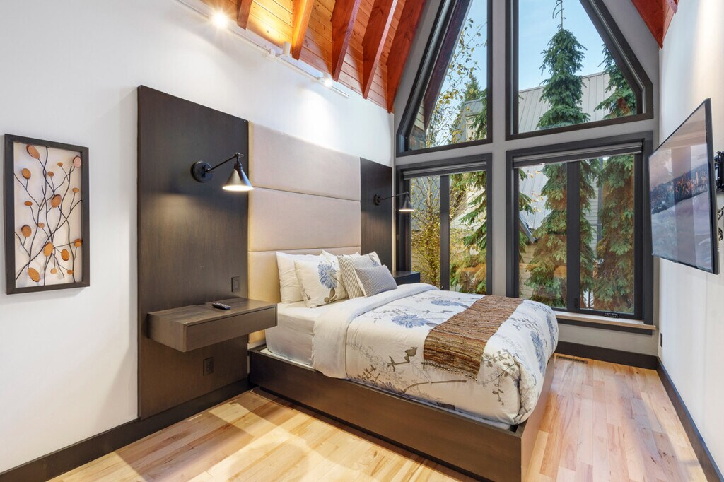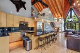 Feel at home in this 6-bed, 5-bath alpine chalet in Whistler’s peaceful Nesters neighborhood. Surrounded by evergreens, this spacious home features soaring wood-beam ceilings, a cozy stone fireplace, and floor-to-ceiling windows framing serene forest views. Just minutes from Whistler Village and the slopes, it’s ideal for group getaways year-round. This 3,000 sq ft chalet across 3 levels offers an open-concept living room with soaring cedar ceilings and a stone fireplace. The gourmet kitchen features Viking appliances and island seating. Enjoy the loft music lounge, a private deck with BBQ and outdoor hot tub, and a game area with a Wii, poker, darts, and boardgames. In-home laundry is available with a washer and dryer on the ground floor. Driveway parking is available for 5 vehicles. No events, parties, or large gatherings are allowed. [SI]