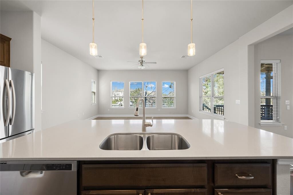 Experience the pinnacle of executive living in this stunning, light-filled residence—the ultimate lock-and-leave sanctuary. This free standing condo boasts 4 generously-sized bedrooms and 3 full luxury bathrooms, the home's open-concept design is ideal for entertaining, seamlessly connecting the kitchen to the sophisticated main living area. The kitchen features premium stainless steel appliances, a high-efficiency gas cooktop, sleek Silestone counters, and an oversized center island with a double sink, perfectly blending form and function. Retreat to the expansive primary suite, offering a spa-like ensuite bathroom with a commanding walk-in shower. A versatile fourth bedroom on the main level is perfectly configured as a private executive office or guest quarters. Efficiency is paramount, highlighted by dual tankless water heaters. This property is curated for a low-maintenance lifestyle, perfect for the discerning, busy professional who values their time. Enjoy very minimal upkeep as the HOA maintains the front yard and the backyard includes high-end turf. Savor beautiful sunsets from the primary suite and the upstairs flex room. Community amenities, including dedicated green spaces, dog parks, and a contemporary park pavilion, further elevate the experience. Enjoy unparalleled convenience with proximity to essential services and premier recreation at Lakes Austin and Travis, including great hiking/biking. Zoned to top-rated LISD schools, including Vandegrift High School, and located close to High Point 2222, HEB, Cineapolis, dining, and shopping. MLS ID 1290695