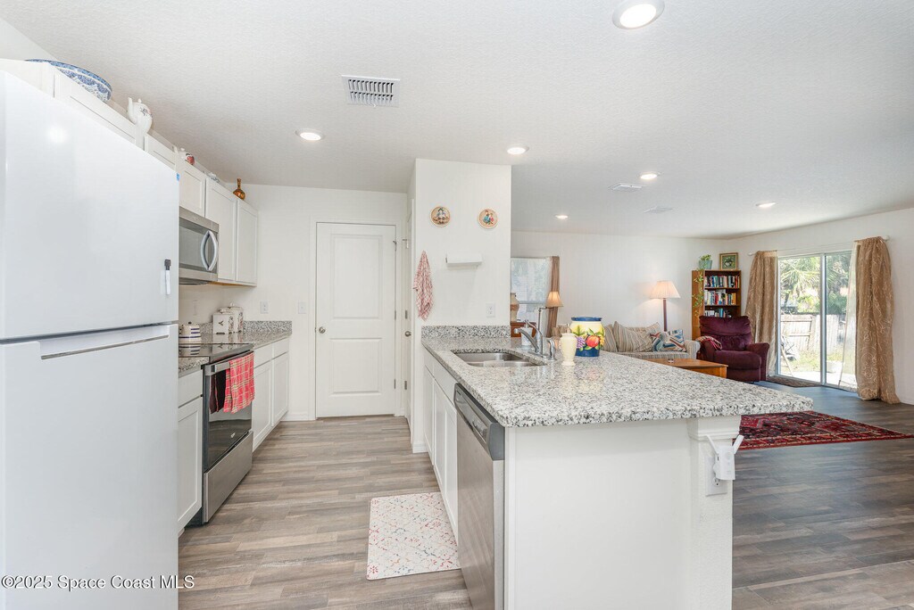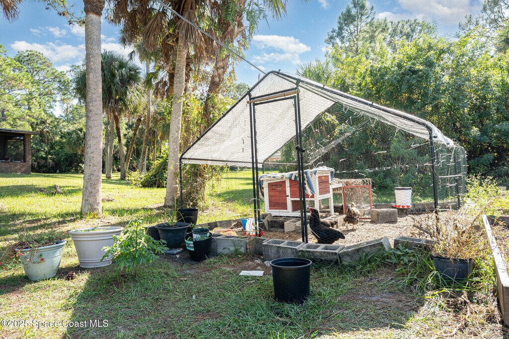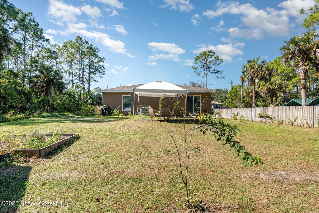 Nestled in the tree lined streets of Palm Bay,this 3 bed / 2 bath features an open floor plan,fruit trees and solar panels! The kitchen boasts granite countertops,white shaker cabinets,stainless steel appliances,and bar seating. The primary ensuite offers a double vanity with granite countertops and walk-in closet. Additional bedrooms offer maximum storage with walk-in closets. Vinyl plank in main living areas. Indoor laundry room. No water bill (well),no sewer bill (septic),and solar panels significantly reduce your electricity bill! Gardener's paradise with citrus,grape,cherry,pineapple,fig,bananas,mango,avocado,lettuce beds,elderberry,basil and so much more! Minutes away from major shopping centers,restaurants,parks,and quick access to I95.