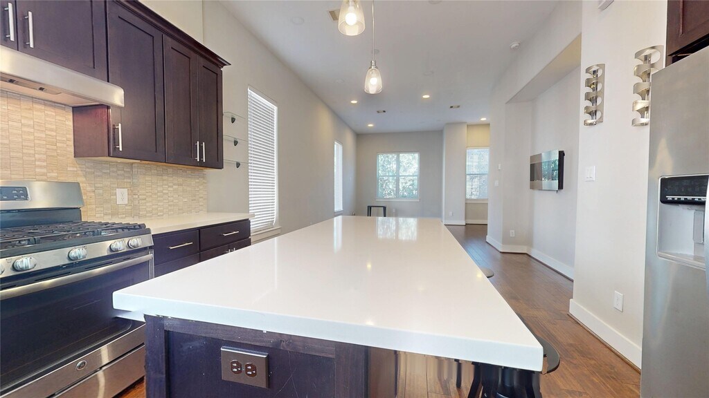 Now available for lease,this modern three-story home offers the perfect mix of comfort,style,and flexibility in Houston’s vibrant East Downtown. Just minutes from Downtown attractions,dining,and nightlife,this property is ideal for professionals seeking a convenient urban lifestyle. The home features three spacious bedrooms and three-and-a-half baths,each level designed for privacy and versatility. The first-floor suite is perfect for a home office,guest room,or roommate setup. The second floor’s open layout includes a sleek kitchen with quartz countertops,stainless steel appliances,and a large island that flows seamlessly into bright living and dining areas with hardwood floors. Upstairs,the primary suite offers a spa-like retreat with dual vanities,soaking tub,walk-in shower,and a generous closet,plus an additional ensuite bedroom for extra comfort. Perfect home for three roommates seeking a modern,convenient downtown lifestyle. MLS# 37636429