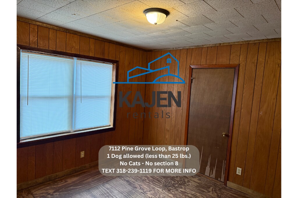 -Text "viewing instructions 7112 Pine Grove Loop" We will then send you the instructions to do a self showing. -No Section 8 -1 Dog allowed (less than 25 lbs.) with $200 (nonrefundable) Pet Processing & Lease Addendum Fee and monthly pet rent. **No cats. -No rent to own -No smoking inside -Rent is $825.00 -Deposit is $700.00 -Income will be verified on each tenant. -Central Heat and AC. -Located at 7112 Pine Grove Loop Rd Bastrop 71220 -Includes stove. -3 bedroom 2 bath home. -You pay utilities (water, gas, electric, trash, Lawncare) -$50 application fee per adult.