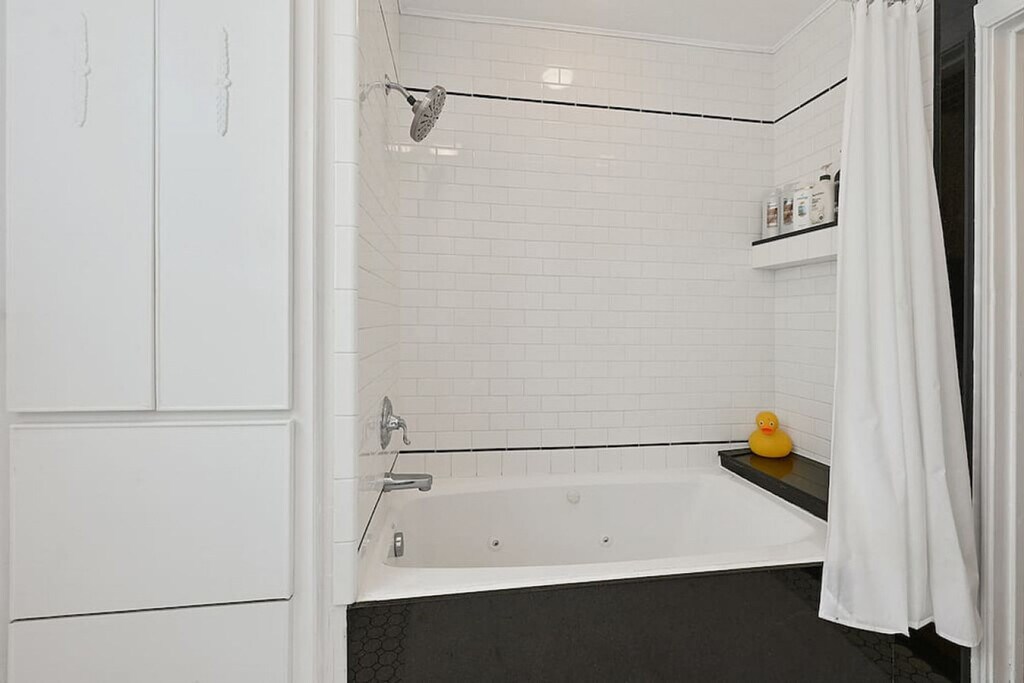 Feel at home in Bluebird Cottage, a charming getaway in Bryan-College Station, just minutes from Texas A&M, Kyle Field, H-E-B, Big Shots Golf, and Century Square. This thoughtfully updated 1944 cottage blends vintage charm with modern comfort and features 2-bedrooms plus a bonus room to sleep up to 7. The cottage features a living room with a 55” smart TV, couch, swivel chairs, bench seating, board games, and blackout curtains. The kitchen is fully stocked with stainless appliances, a gas stovetop with griddle, cookware, spices, blender, toaster, slow cooker, and a coffee bar with a Keurig and French press. There is also a laundry area with a washer, dryer, iron, and steamer. Enjoy the private backyard and patio with a 6-person hot tub, outdoor dining table, custom grill, and games like cornhole, ladder ball, and bocce. Bluebird Cottage is the perfect home base to explore all that Bryan-College Station has to offer. Take your shoes off before entering to protect the original 1944 wood floors. Events may be approved on a case-by-case basis for an additional fee of $300 and an additional security deposit. Glitter or anything sticky is not permitted in the house or on the walls; a minimum $500 fine will be charged for repairs to the sheetrock. Be careful with the original and delicate door handles. Trash goes out on Thursday; place the can on the street. Be extra careful of the trees in the driveway. No smoking is allowed. Pets are not allowed without express permission and a paid fee. Early check-in and late check-out are not allowed without express permission and a paid fee of $50 per hour. Bedroom 1 includes a desk, chair, and USB charging. [SI]