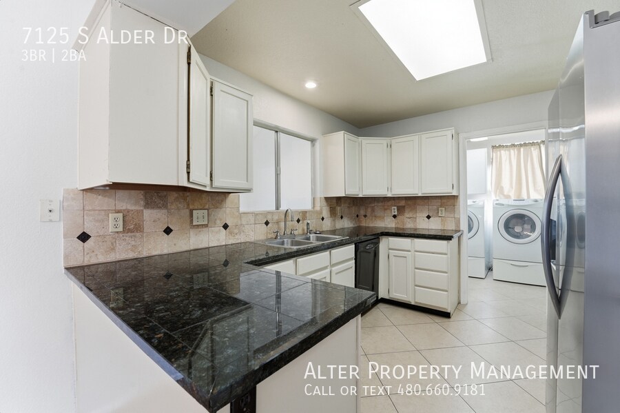 Contact us between 9:00 am and 6:00 pm, 7 days a week to speak with a real member of Alter Property Management. *** Move in by 3/5/2026 and receive $750.00 off your move-in costs. *** Spacious 2 bedroom plus office home near Kyrene with a flexible layout that lives like a 3 bedroom. In addition to the main living room, this home also features a separate den, perfect for a home office, playroom, or additional lounge space. The kitchen offers granite tile countertops, a breakfast bar, and tile flooring, and includes refrigerator, washer, and dryer for your convenience. The open layout provides comfortable living and functional space throughout. Enjoy desert easy landscaping with minimal upkeep and a 2 car garage offering secure parking and extra storage. The home is surrounded by gorgeously renovated properties, reflecting strong pride of ownership and high property values in the neighborhood. Conveniently located near Kyrene schools, shopping, dining, and freeway access. Available for immediate move-in. Reach out today to schedule a showing.