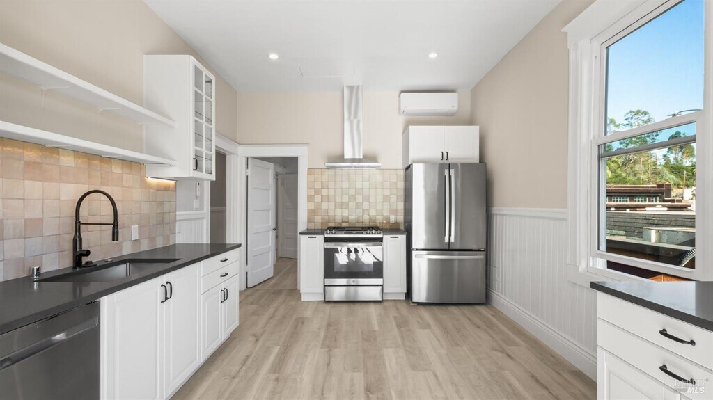 A oasis with a view, unexpectedly quiet despite its proximity to Sir Francis Drake. Recently remodeled and upgraded, this spacious 2-bed/1-bath is on the top floor of a cheerful blue Edwardian, right in the heart of San Anselmo. Built in 1906, high coved ceilings with traditional decorative moulding allow for great natural light and a feeling of spaciousness. Enjoy cooking and entertaining in the extra-large kitchen with new range, refrigerator and dishwasher. The separate dining area opens to to a shared balcony with views of the Ross Valley, including Mt. Tam, Bald Hill and the Seminary. Entertain or relax in the separate living room. All appliances just installed! New and efficient mini-splits provide A/C and heat, a rare find in rentals. The stackable washer and dryer means no more trips to the laundromat! Unit is pre-wired for internet and TV. One off-street parking spot next to the building is included. Move right in and enjoy the shopping, dining, entertainment, fine schools and recreation that San Anselmo has to offer! MLS#325092493