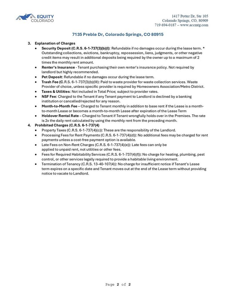 Newer 3 bedroom, 2 1/2 bath, 2 story home located in Meadowbrook Crossing. Attached 2 car garage, separate loft, stainless steel appliances, Central Air Conditioning, fenced backyard, sprinkler system. Hard surface flooring on main level and carpet on 2nd level with bedrooms. Large walk in closet in master bedroom. House is move in ready. All utilities are responsibility of tenant. The property owner has the sole discretion in accepting or declining a pet. No more than 1 pet is ever allowed. Picture of pet will be required. For Assistance Animals, we follow HUD Guidelines. Pet Deposit $300.00 (refundable) and Pet Rent is $35.00/month (Not Refundable) Applicant has the right to provide Equity Colorado, Inc with a Portable Tenant Screening Report (PTSR) that is not more than 60 days old, as defined in § 38-12-902(2.5), Colorado Revised Statutes; and 2) if Applicant provides Equity Colorado, Inc with a PTSR, Equity Colorado, Inc is prohibited from: a) charging Applicant a rental application fee; or b) charging Applicant a fee for Equity Colorado, Inc to access or use the PTSR. 1. Total Monthly Cost of Rental (C.R.S. 6-1-737(2)(a) Total Amount Due Per Month: $2,295.00* (*Includes all mandatory fees except for government taxes and separately billed utilities, if applicable.*) Note: Some costs, such as utilities and optional services, are subject to change based on provider rates, tenant usage, or other external factors. The total price may vary accordingly. Breakdown of Included Mandatory Charges Rent and Not Rent Base Monthly Rent $2,295.00 Fixed Charge for occupancy of the premises paid to the Landlord Utility Charges Amount Variable Charge Actual cost based on usage paid to the Utility Provider Trash Services $0.00 Fixed Charge Waste Collection Fee Paid by Owner through HOA 2. Additional Charges – Not Included in Total Monthly Cost of Rental The following fees are applicable but are NOT Included in the total rental cost above Application Fee per applicant over 18 years old $45.00 Fixed Amount Not Refundable Paid to Screening Provider Security Deposit (Mandatory) $2,295.00 Variable Charge * Refundable Paid to Landlord Renter’s Insurance (Optional) Variable Charge amount and refundability are per terms of Insurer Policy and Paid to Insurer Pet Deposit (Optional) $300.00 Fixed Charge Refundable Paid to the Landlord Monthly Pet Rent (Optional) $35.00 Fixed Amount Not Refundable Paid to the Landlord Late Fee (Situational) $50 or 5% of the rent balance due, whichever is higher Fixed Amount Not Refundable Paid to the Landlord NSF Fee (Situational) $20.00 or actual bank charges, whichever is higher Fixed Amount Not Refundable Paid to the Landlord Month to Month Fee (Optional) Additional fee equal to 10% of rental amount Fixed Amount Not Refundable Paid to the Landlord Holdover Rental Rate (Situational) 2x the daily rent Fixed Amount Not Refundable Paid to the Landlord 3. Explanation of Charges • Security Deposit (C.R.S. 6-1-737(3)(b)(I): Refundable if no damages occur during the lease term. * Outstanding collections, evictions, bankruptcy, repossession, liens, judgments, or other negative credit items may result in additional deposits being required by the owner up to a maximum of 2 times the monthly rent amount. • Renter’s Insurance - Tenant purchasing their own renter’s insurance policy. Not required by landlord but highly recommended. • Pet Deposit: Refundable if no damages occur during the lease term. • Trash Fee (C.R.S. 6-1-737(3)(b)(III): Paid to waste provider for waste collection services. Waste Provider of choice, unless specific provider is required by Homeowners Association/Metro District. • Taxes & Utilities: Not included in Total Price; subject to provider rates. • NSF Fee: Charged to the Tenant if any Tenant payment to Landlord is declined by a banking institution or cancelled/rejected for any reason. • Month-to-Month Fee – Charged to Tenant monthly in addition to base rent if the Lease is a month-to-month Lease or becomes a month-to-month Lease after expiration of the Lease Term • Holdover Rental Rate – Charged to Tenant if Tenant wrongfully holds over in the Premises. The rate is 2x the daily rent calculated by using the monthly rent from the preceding month. 4. Prohibited Charges (C.R.S. 6-1-737(4) • Property Taxes (C.R.S. 6-1-737(4)(c)): These are the responsibility of the Landlord. • Processing Fees for Rent Payments (C.R.S. 6-1-737(4)(d)): No additional fees may be charged for rent payments unless a cost-free payment option is available. • Late Fees on Non-Rent Charges (C.R.S. 6-1-737(4)(e)): Late fees can only be applied to unpaid rent, not utilities or other fees. • Fees for Required Habitability Services (C.R.S. 6-1-737(4)(f)): No charge for heating, plumbing, pest control, or other services legally required to provide a habitable living environment. • Termination of Tenancy (C.R.S. 13-40-107(4)): No charge for insufficient notice if Tenant’s Lease term expires on a specific date and Tenant moves out at the end of the Lease term without providing notice to vacate to Landlord.
