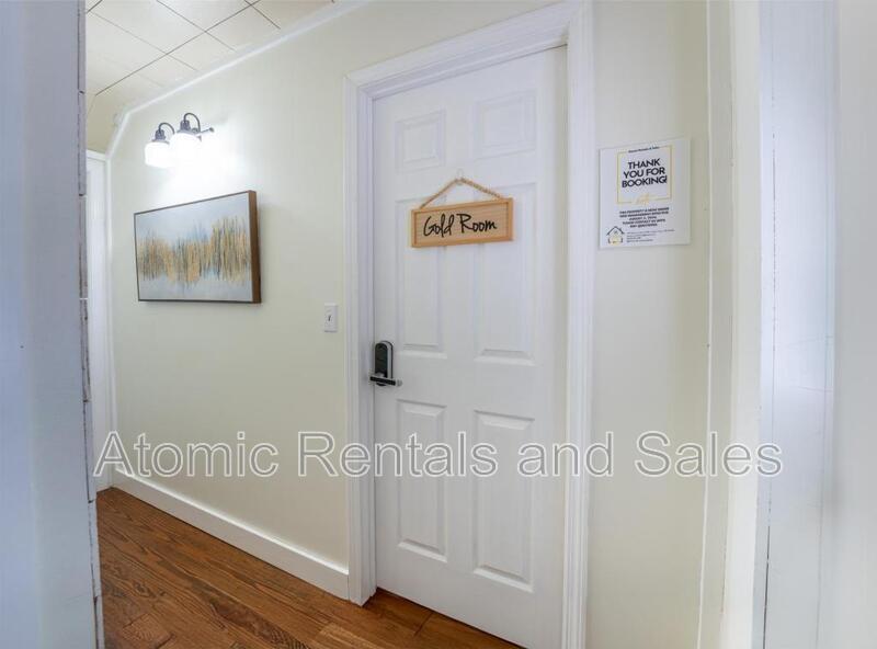 Available as a furnished short, mid or long-term rental. Welcome to The Cottage on Jefferson! The Gold Suite is a unique, stylish room in a house with three other private rooms. It features a gorgeous claw-foot tub and a luxurious king-sized bed. The house is in central Jefferson City, TN, a third mile from Carson Newman University. Two lakes and the Smokies are close for those who like to spend time outdoors. The room has everything you need for a comfy stay. The clawfoot tub has a handheld showerhead. You will enjoy a private half bath with a vanity and toilet. For convenience, a mini fridge, microwave, and Keurig coffee maker are in the room. Shared spaces are the hallways and exterior of the home. You'll enjoy access to a grill outside, a firepit with seating, picnic table and shared washer/dryer. NOTE: There is not a stand-up shower, full kitchen or washer and dryer in this room. Please feel free to contact us for pricing and availability. Book directly through our company for savings or Airbnb at
