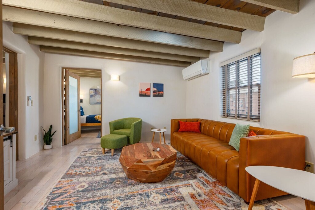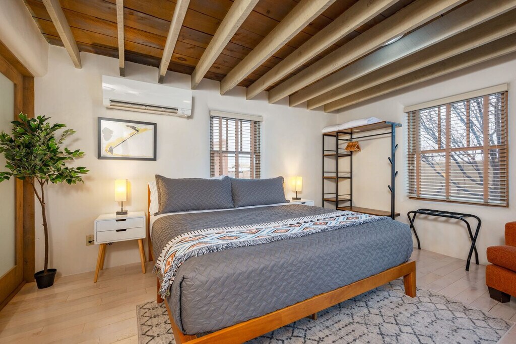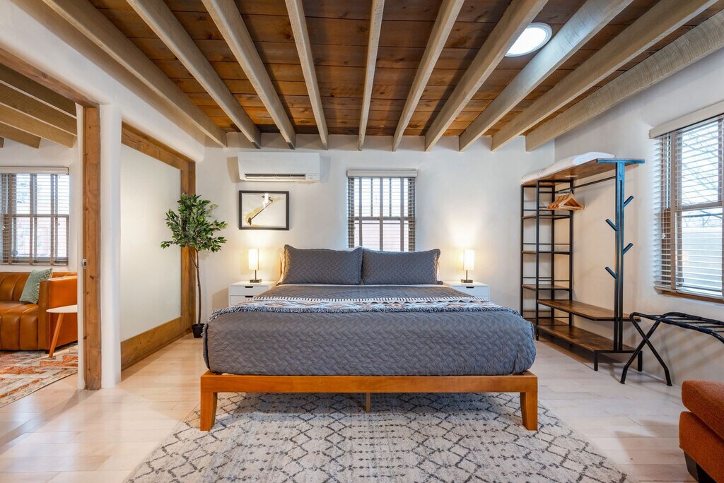 Feel at home in this centrally located adobe casita in the vibrant Railyard district. This charming two-bedroom home features a king-size bed in one room and two twin beds in the other, a functional kitchen, and a lovely backyard with a firepit. Step into the enchanting private walled courtyard and let the magic unfold. Inside, discover a thoughtfully designed living space that seamlessly combines modern trends with the timeless appeal of adobe architecture. The cozy living area and bedrooms are curated for comfort, while the private outdoor patio offers a haven for al fresco dining or unwinding in the fresh air with seating for four and a gas firepit. The kitchen is fully functional with an electric cooktop, gas oven, fridge and freezer, and small appliances. Baby equipment is available on a first-come, first-served basis for an additional fee. Pets are allowed on a case-by-case basis with an additional fee of $35 per pet per night. You must reach out about your pet prior to making your reservation. Pets are subject to excess cleaning and damage fees if needed. If evidence of an unapproved pet is found at the property, you will be charged a minimum $300 cleaning fee. Located in the coveted Railyard district, this casita offers a walkable and bikeable lifestyle with easy access to the Farmer's Market, eclectic shopping, diverse restaurants, theaters, and the nearby train station. Nature enthusiasts will appreciate the proximity to walking trails, providing a seamless blend of urban and outdoor living. The Santa Fe Plaza is about 1.5 miles away, featuring historical and artistic locations, while Canyon Road and Museum Hill are also nearby. Quiet hours are between 10 PM and 6 AM. A lost key or lockout incurs a $50 fee. Please park only in the designated parking area. Smoking indoors is not allowed, and a $500 cleaning fee will be charged if you smoke in the house. Check-in is after 3 PM and check-out is by 10 AM. If you check-out late without approval, a late check-out fee of $40 per hour may be charged. Guests are required to keep the property and all furnishings in good order and not to rearrange furniture. In the event of damage, missing items, or non-working items, please inform immediately. Access to the property for repair and inspection is allowed in a reasonable manner except in emergencies. Personal belongings found after departure can be shipped at your cost. Registration Number: STR236150