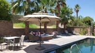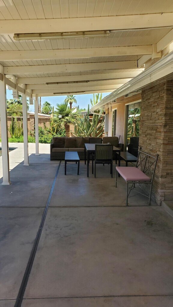 Welcome to this beautifully remodeled 2-bedroom,2-bathroom home,designed for comfort,style,and effortless entertaining. Step into a private backyard oasis featuring a sparkling pool,expansive covered patio,and breathtaking mountain viewsperfect for relaxing or hosting guests. Inside,you'll find a fully tiled interior with an airy open-concept layout,accentuated by clerestory windows that flood the space with natural light. The chef-inspired kitchen showcases gleaming quartz countertops and seamlessly connects to the dining and living areas,all with direct views of the backyard. The home comfortably sleeps guests with a California King in the primary bedroom and two bunk beds in the second room,both equipped with 42-inch flat-screen TVs. The spacious driveway provides direct backyard access and can accommodate up to six vehicles. Conveniently located just five minutes from The River,Westfield Mall,Whole Foods,Trader Joe's,and the area's top dining and shopping destinationsthis home offers the perfect desert retreat. Now available for seasonal,long term,and summer rental.