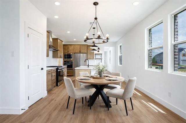 Welcome to 718 Sunflower Trail, a stunning home located in the vibrant Heritage Ranch community of Sherman, Texas. This thoughtfully designed residence features five spacious bedrooms and three full bathrooms, including two primary suites on the main floor—perfect for multi-generational living or long-term guests. With two living areas—one upstairs and one downstairs—there’s ample room for relaxing, entertaining, or working remotely. The open-concept kitchen boasts stainless steel appliances, modern fixtures, and warm wood cabinetry, seamlessly connecting to the main living and dining spaces. Stylish lighting, luxury vinyl plank flooring, and high-end finishes add a refined touch throughout the home. The upstairs living area offers a flexible retreat ideal for movie nights, a game room, or creative space. One of the home’s standout features is the expansive patio door that opens fully to create a seamless transition between indoor and outdoor living. Whether you're hosting a gathering or enjoying a quiet evening, this feature extends your living space and invites fresh air and natural light into the heart of the home—perfect for embracing the outdoors from the comfort of your living room. Heritage Ranch is a growing community surrounded by new homes and green space, offering a peaceful setting with convenient access to Sherman’s shopping, dining, and new development corridors. Just minutes from Highway 75 and near the upcoming Texas Instruments and GlobiTech campuses, this home delivers the perfect balance of comfort and connectivity.